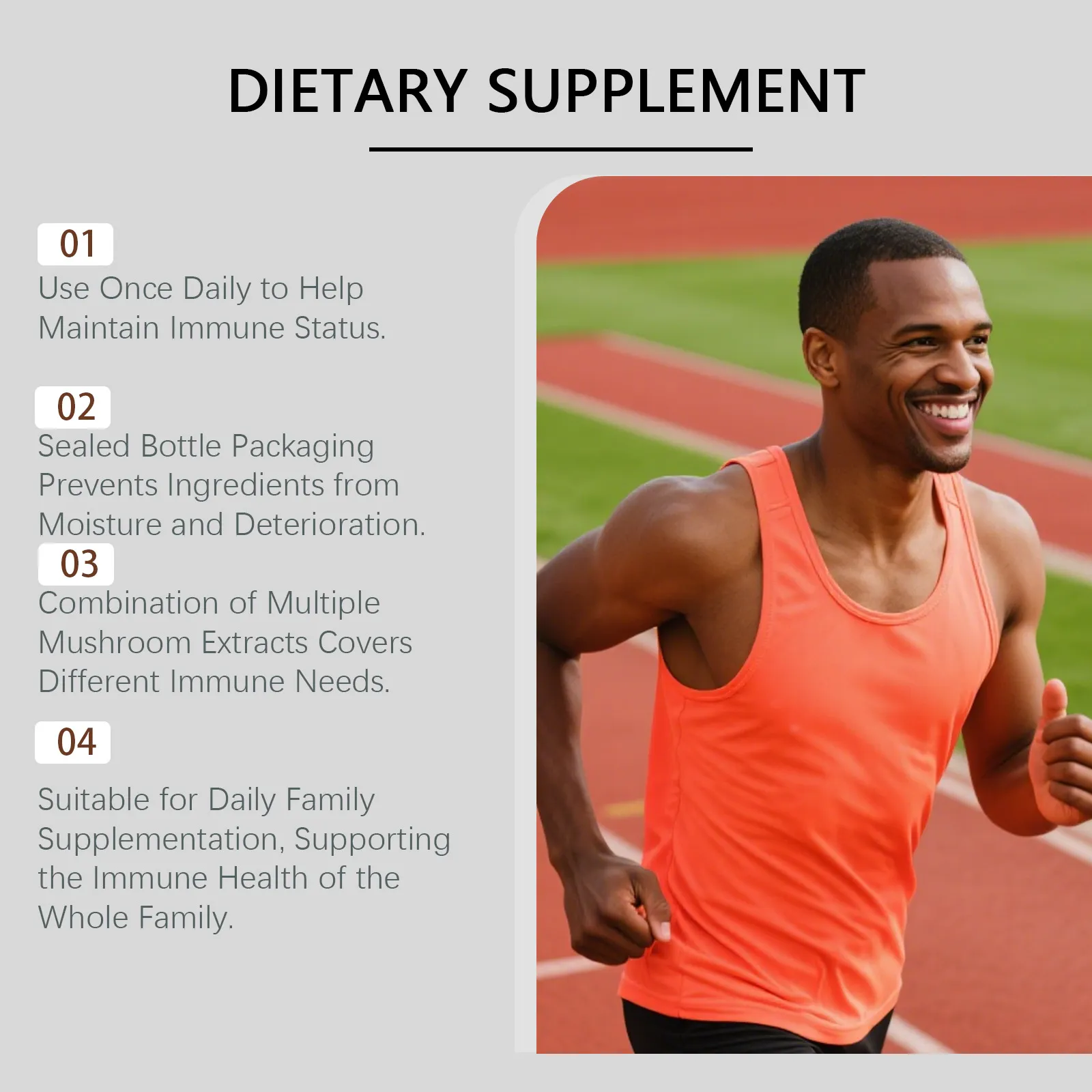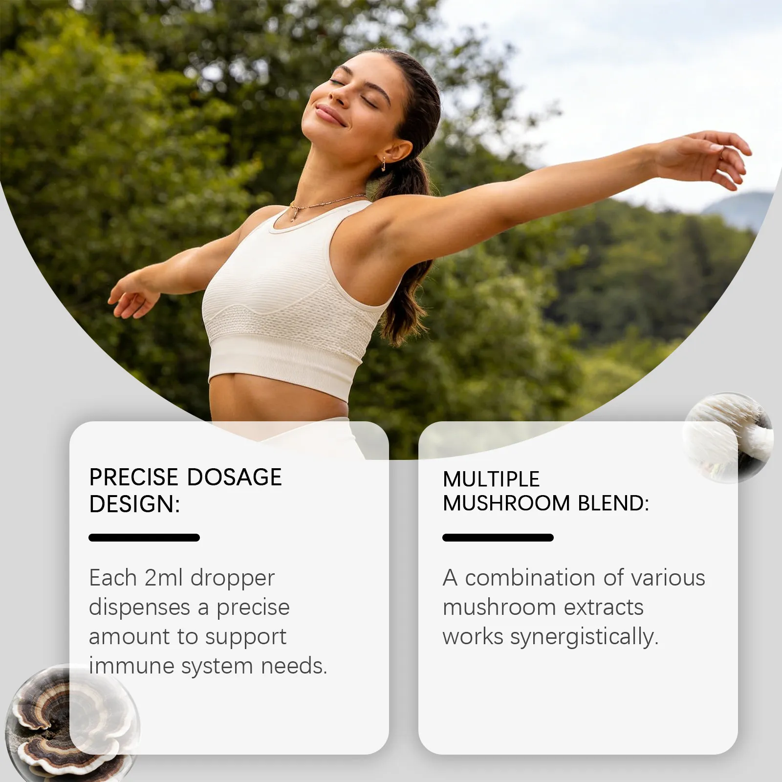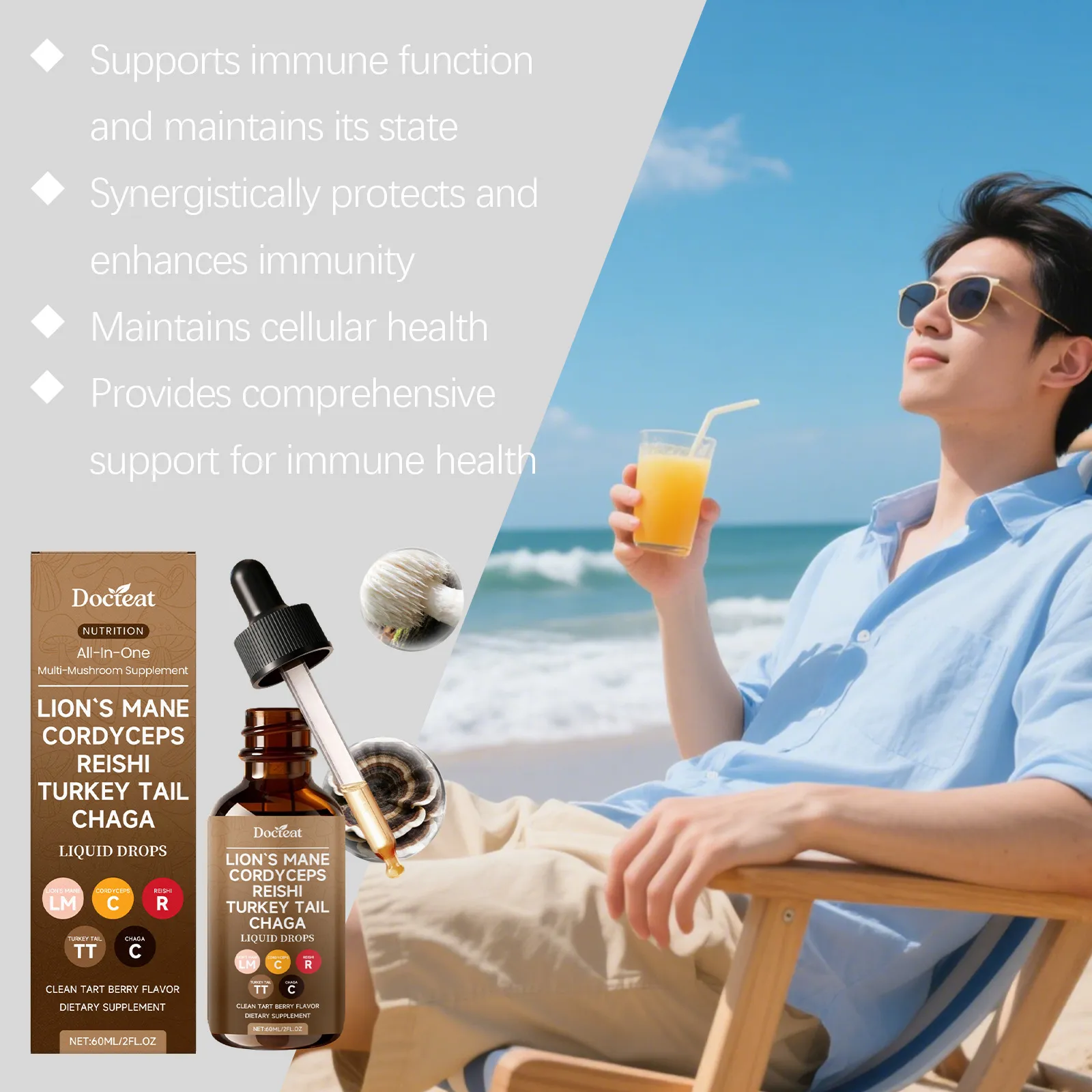 Ingredients: Pleurotus ostreatus extract, Cordyceps sinensis extract, Coriolus versicolor extract, Ganoderma lucidum extract, grape extract,
