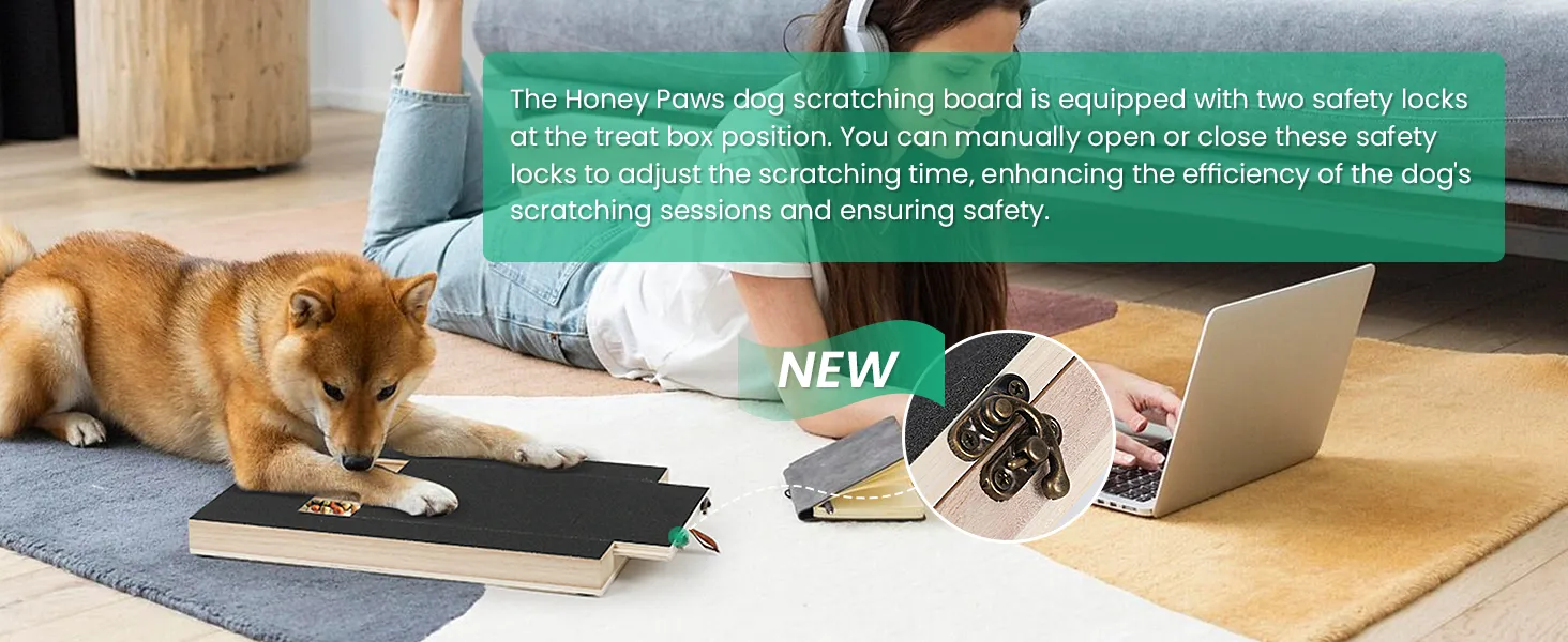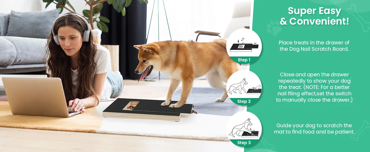 【User-Friendly】The dog scratch pad for nails engages your dog with enjoyable games and enticing treats. The drawer of the scratch board features a manual switch, allowing you to control whether your dog can access the treats by locking or unlocking the drawer, thus regulating the time your dog spends scratching their nails. With patient guidance and brief training, your dog will quickly master this relaxed and amusing method of nail trimming.