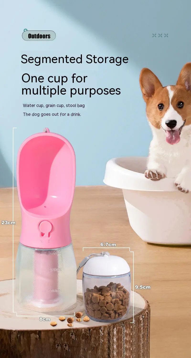 1. 3-in-1 Design: This pet water bottle features a built-in 600ml water, 100g food container, and waste bag compartment, providing