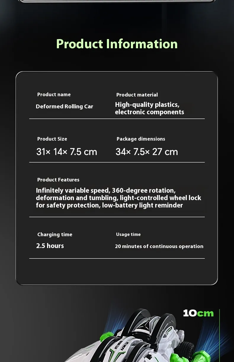 - Six-wheel Stability: The innovative six-wheel design not only makes this car unique but also enhances its performance by offering better control, balance, and stability, especially during flips and turns.