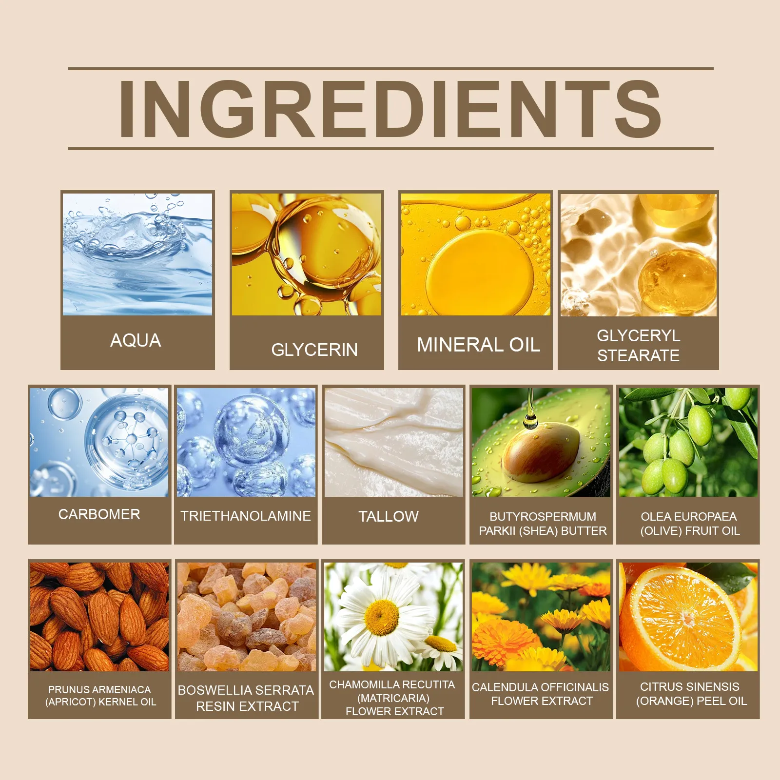 Ingredients: Water, glycerin, mineral oil, Glyceryl stearate, carbomer, triethanolamine, tallow, shea butter, olive oil, apricot oil,