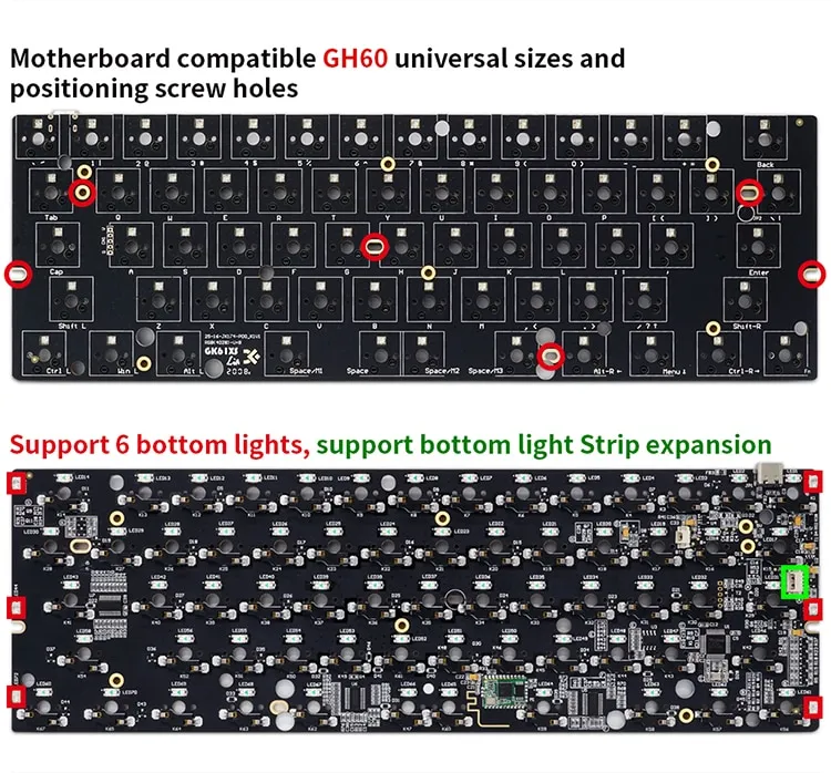 The PCB is optimized for black double-sided immersion gold, and six 16.8 million color RGB bottom lights are added on both sides of the