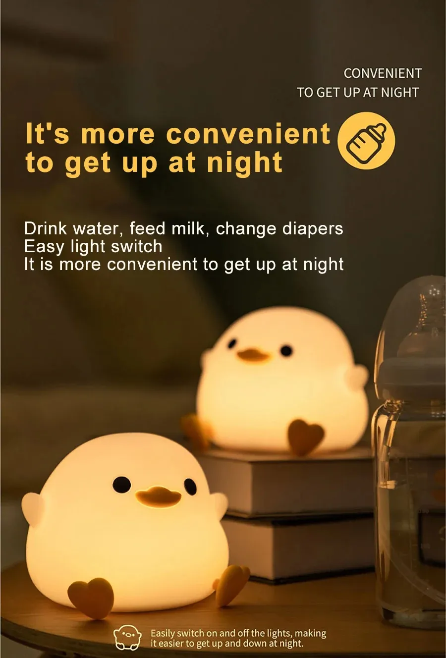 Slide the switch at the bottom of the duck, then squeeze it, and the duckling will glow for you. It is also equipped with a 20-minute timer function, which not only helps children fall asleep