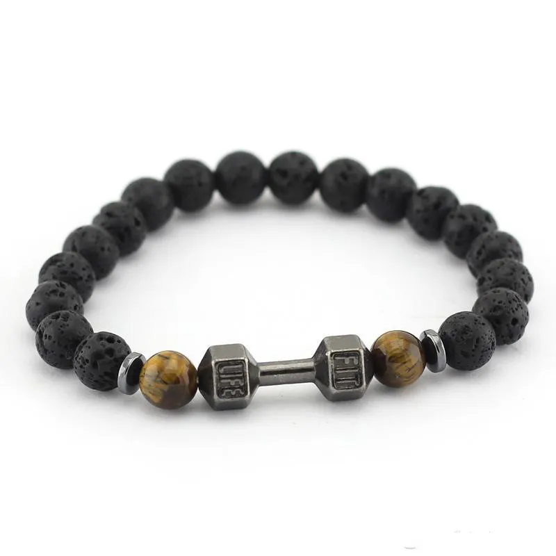 this bracelet is made of volcanic stone, black frosted stone and alloy dumbbell. Lead-free and nickel-free, fits the skin and is comfortable to wear,Natural Stones, Polished, Pure Handmade, Quality Guarantee.All Natural Stones Are Unique, May Be Slightly Different With The Ones Showing On The Photos.