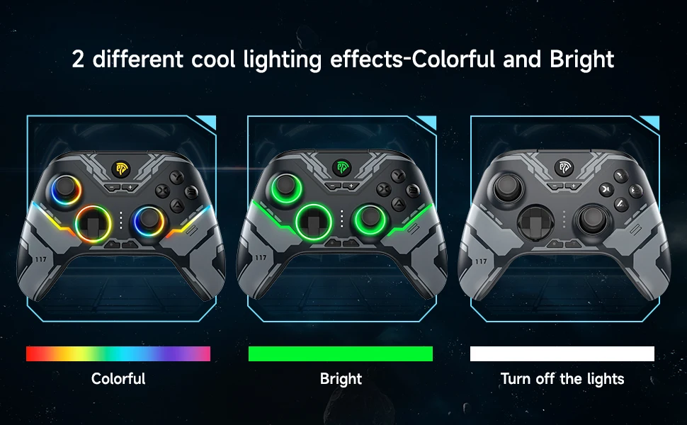 Light Mode: Press "-"+"D pad UP"button to adjust lighting to "Colorful" mode Switching;Press "-"+"D pad Down" button to adjust lighting to
