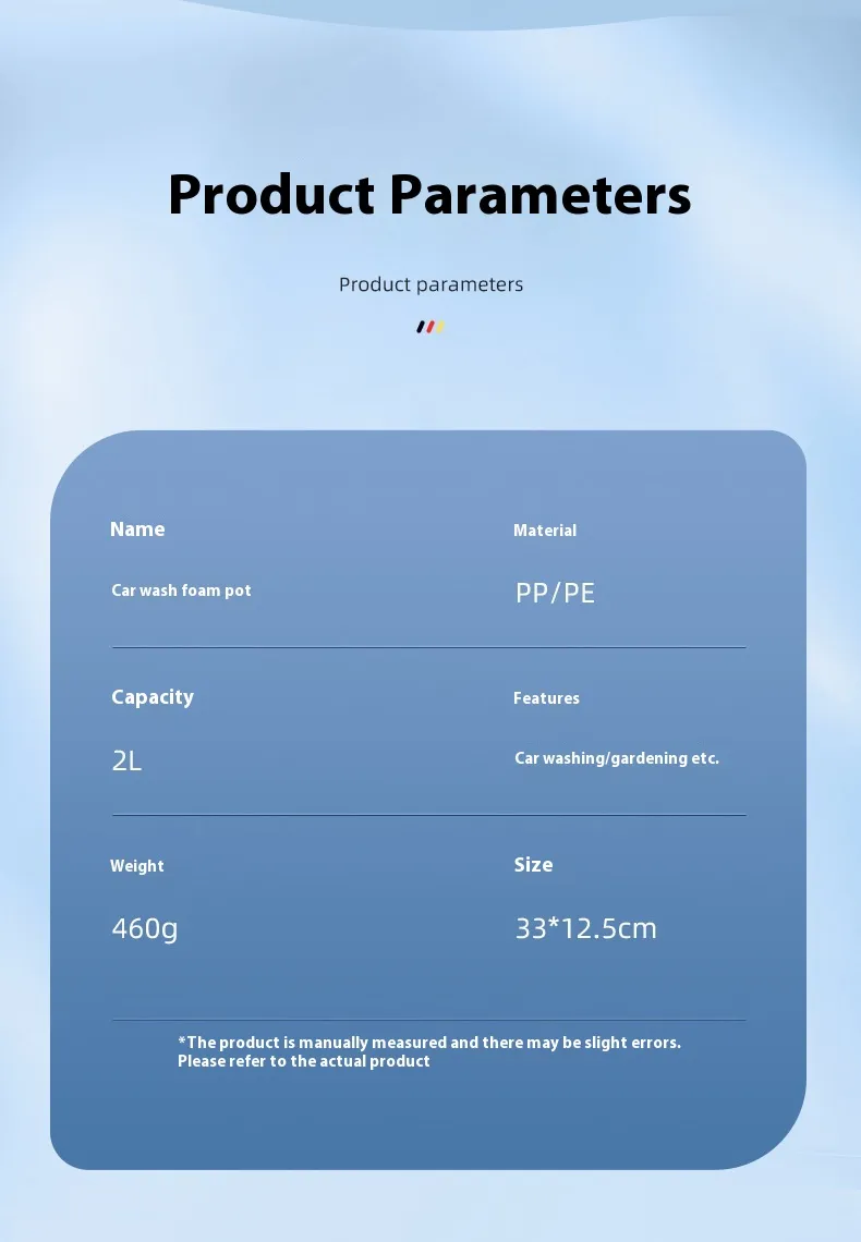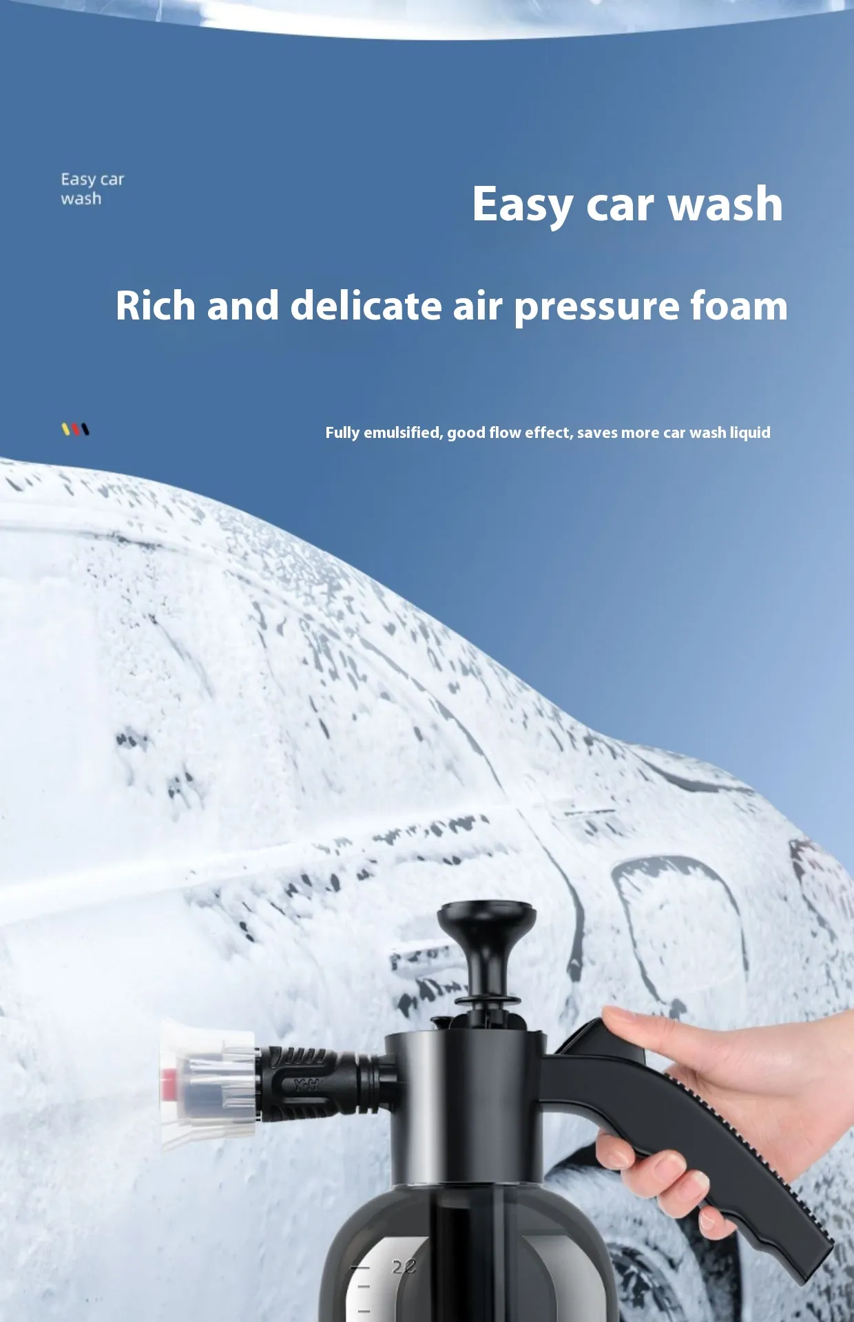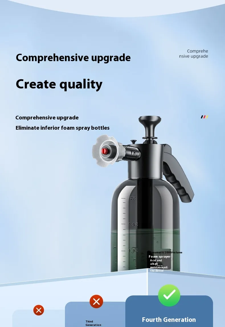 - Large Capacity, Wide Bore,Hand-held ,Portable :2L large capacity can meet your daily car wash needs. The wide bore can be easily filled with liquid to avoid spilling.This handheld foam sprayer is very portable, you can put in the car at any time and anywhere to use.