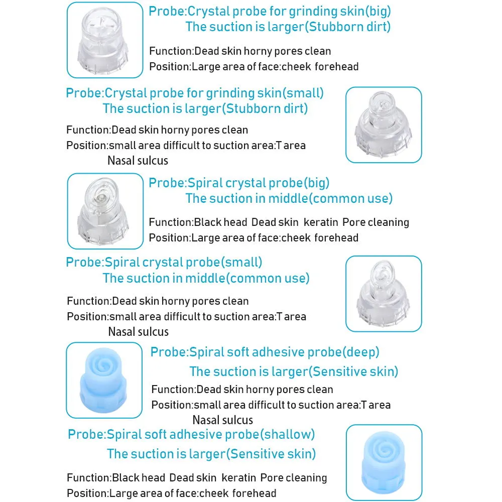 - Small Suction Head: For sensitive areas such as around the eyes and nose.