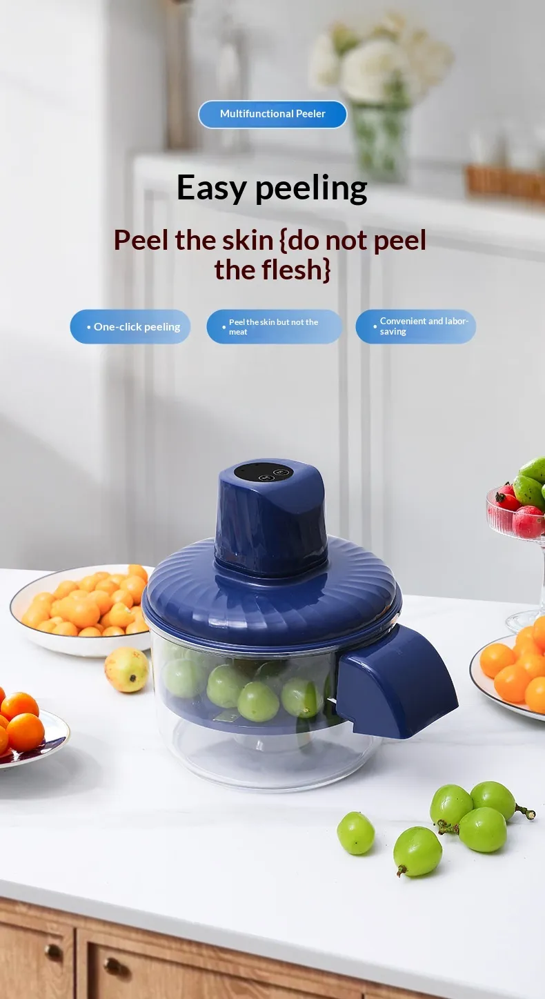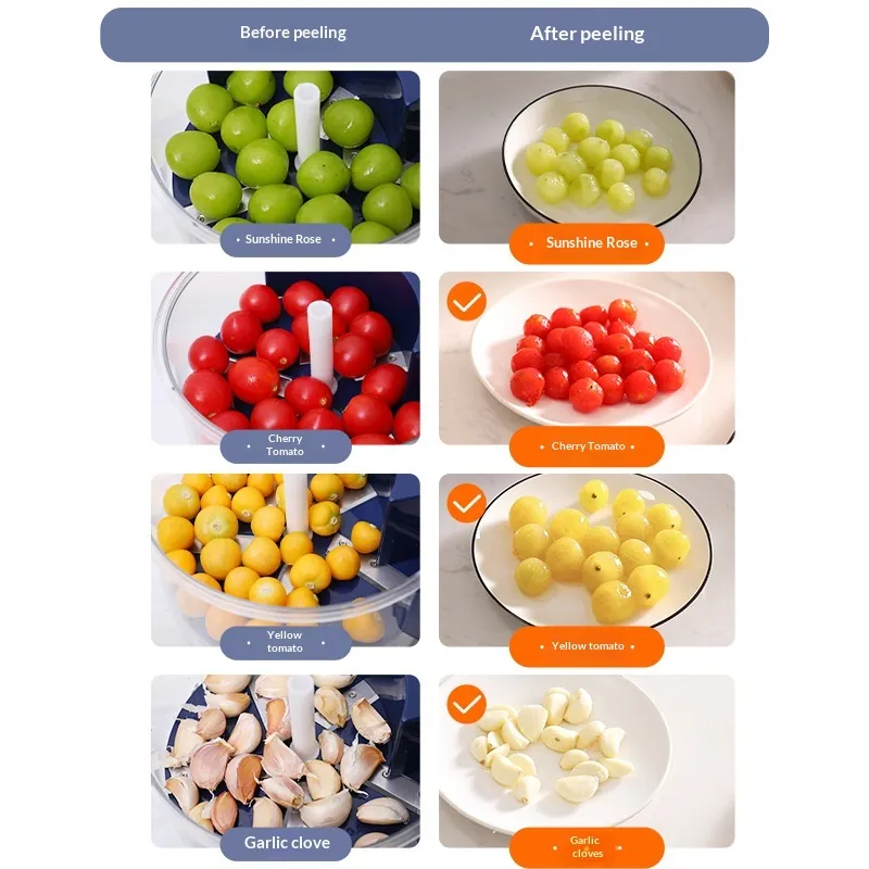 - Multifunctional Garlic Peeler: Versatile and practical, this automatic fruit and vegetable peeler easily handles small to medium smooth-skinned fruits like grapes, loquats, cherry tomatoes, plums, and olives. It can also quickly remove garlic skins without rubbing or crushing, greatly improving preparation efficiency. Equipped with a transparent detachable bowl for real-time monitoring of the peeling process, its compact and safe structure minimizes blind spots — ideal for home and commercial kitchens when making jams, salads, or sauces