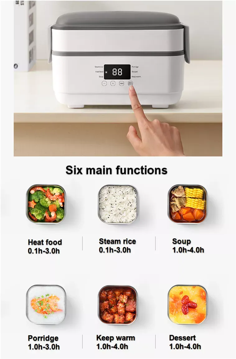 A soup and stew electric heating lunch box is specifically designed for liquid meals such as soups, stews, and sauces. These lunch boxes feature a leak-proof design and come with a smaller container that’s perfect for carrying liquid-based meals. With a built-in heating element, these lunch boxes ensure that your soup stays at the ideal temperature for hours, ready to be enjoyed whenever you’re ready to eat.