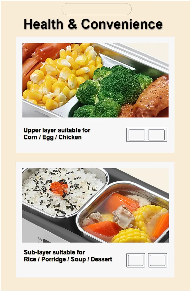 An electric heating lunch box stainless steel is a lunch container with a built-in heating function that allows you to warm up your food without the need for a traditional microwave. The lunch box typically has a stainless steel interior, which offers excellent heat retention and durability. It features an electric heating element that can be plugged into a power source (such as an outlet or a car charger) to heat the food inside.