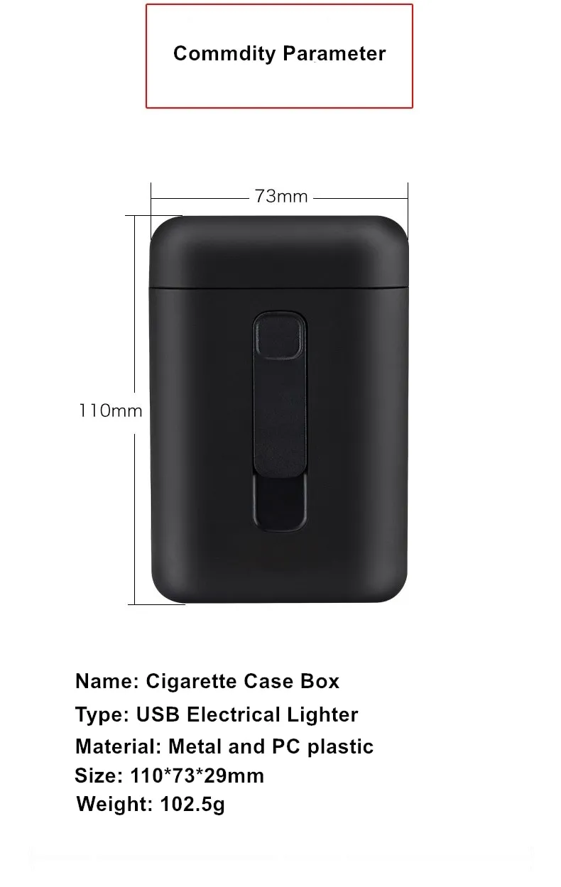 DescriptionMaterialPlasticProduct AttributesOtherPackage Size120*83*40(mm)20 Piece Cigarette Case with USB Cigarette Lighter Electronic Cigarette Lighter for Regular Cigarette Gadgets for Men
