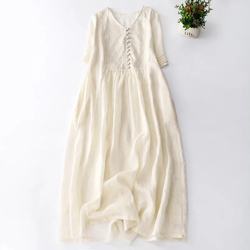 Embroidered Cotton and Linen Solid Color Beige V-Neck Dress