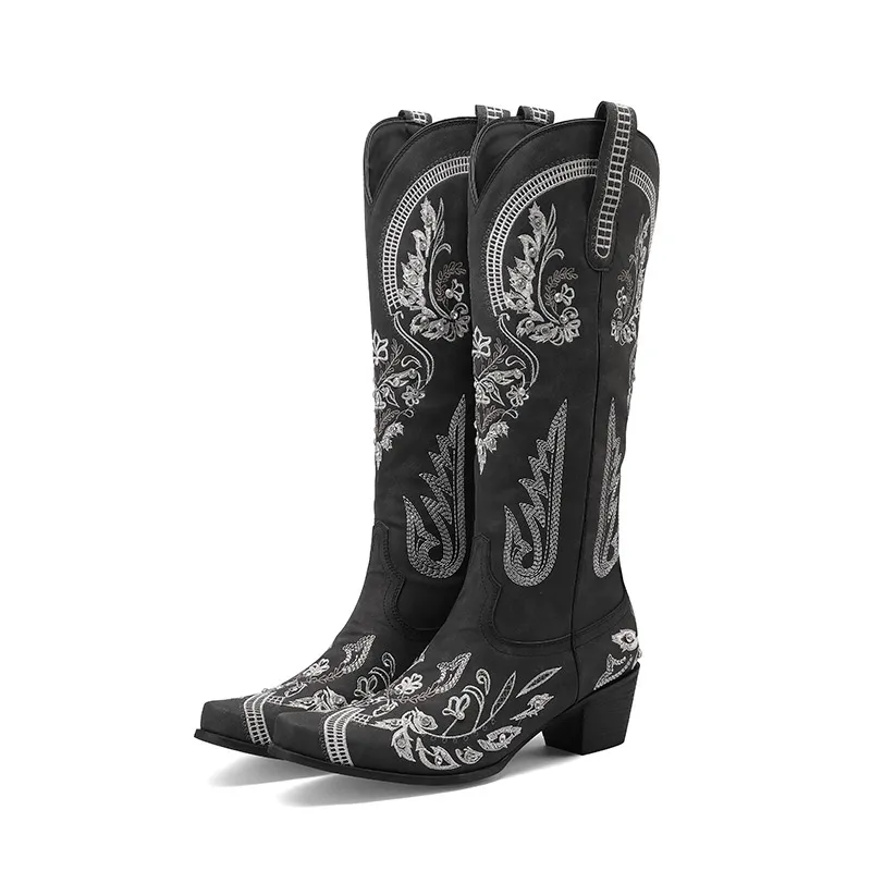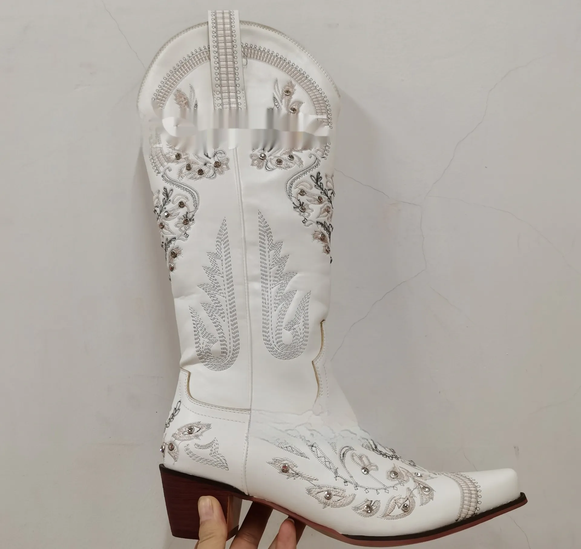 Step into elegance with our Embroidered Rhinestone Thick High Heel Side Zipper High-top Boots – a striking combination of glamour, sophistication, and comfort. These boots are designed for women who want to stand out with every step, blending the artistry of delicate embroidery with the sparkle of shimmering rhinestones.