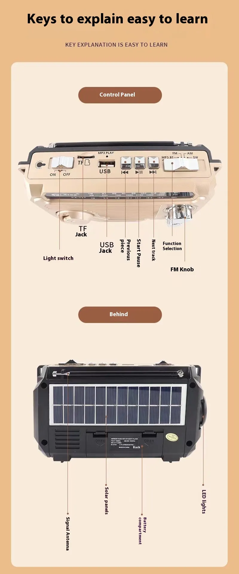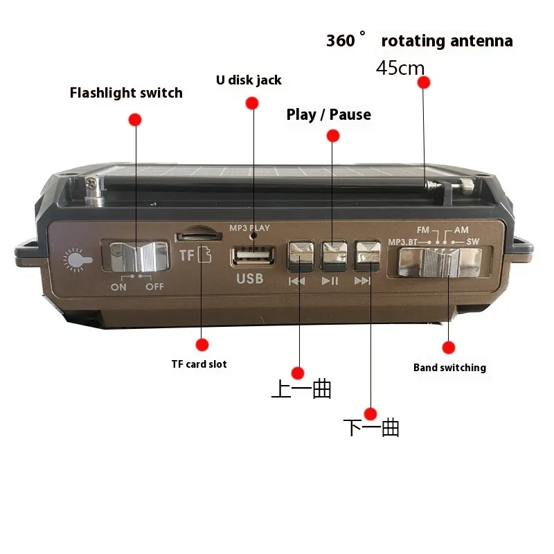 Supporting functions: FM/AM/SW、 Bluetooth, USB flash drive TF