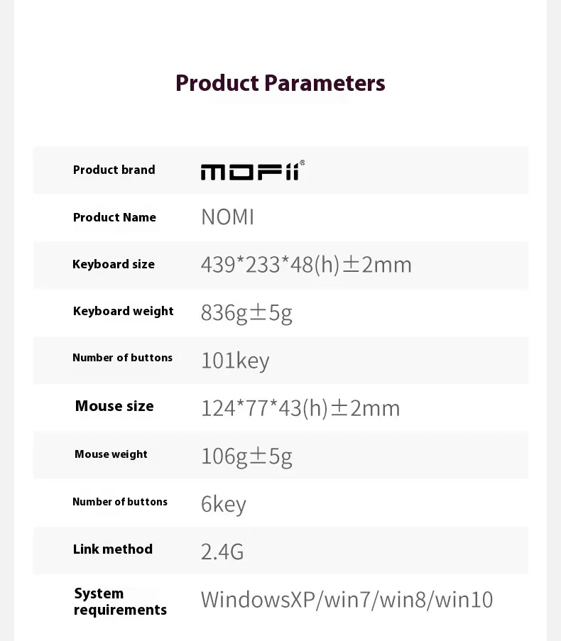 Product Size: keyboard size 439 x233x48(h)2mm mouse size 124 x77x43(h)2mm