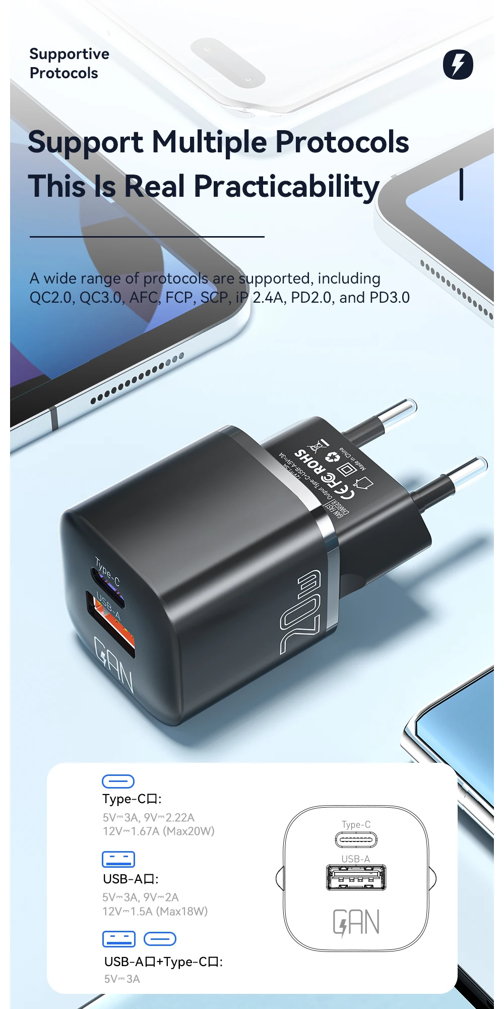 The Essager 20W GaN USB Type-C charger supports PD fast charge and QC 3.0 technology, making it perfect for quick charging iPhone 14, 13, 12, 11 Pro Max, Mini, and iPads. The Gallium Nitride technology ensures efficient and reliable power delivery in a compact design.