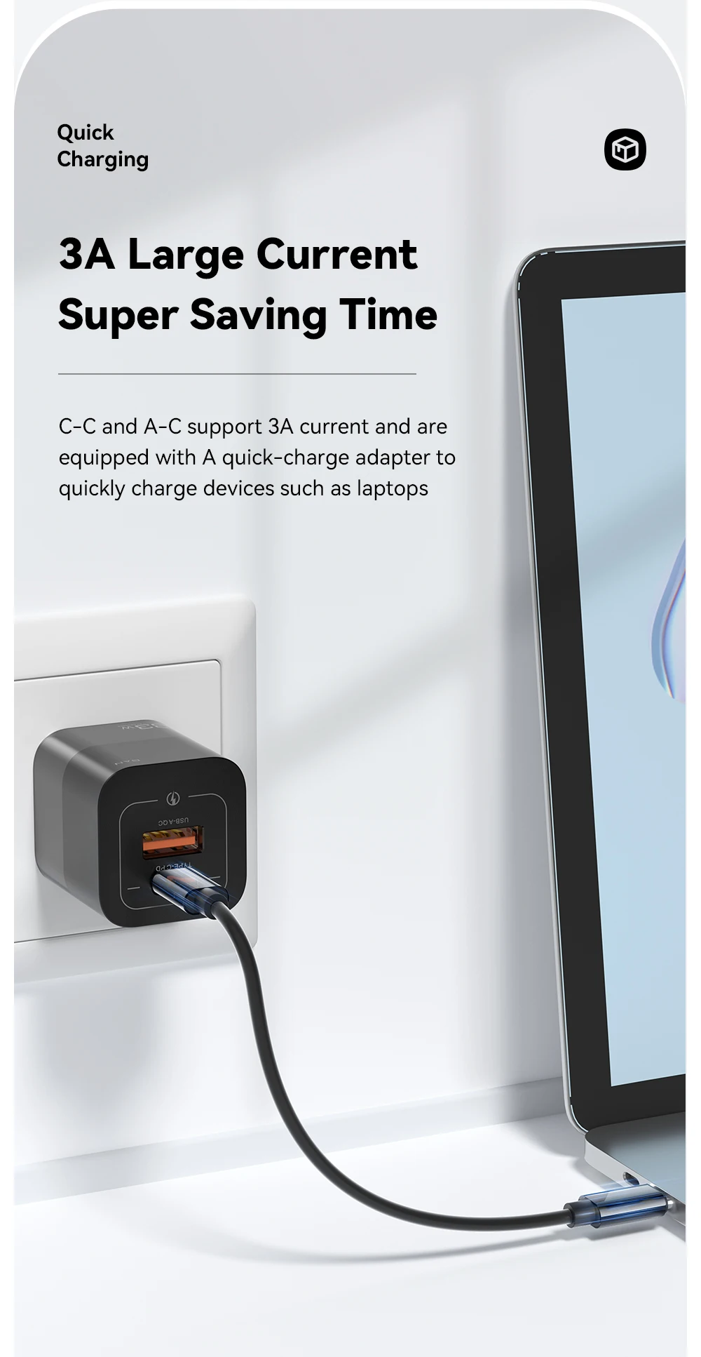 Product DescriptionC-C and A-C support 3A current and areequipped with A quick-charge adapter toquickly charge devices such