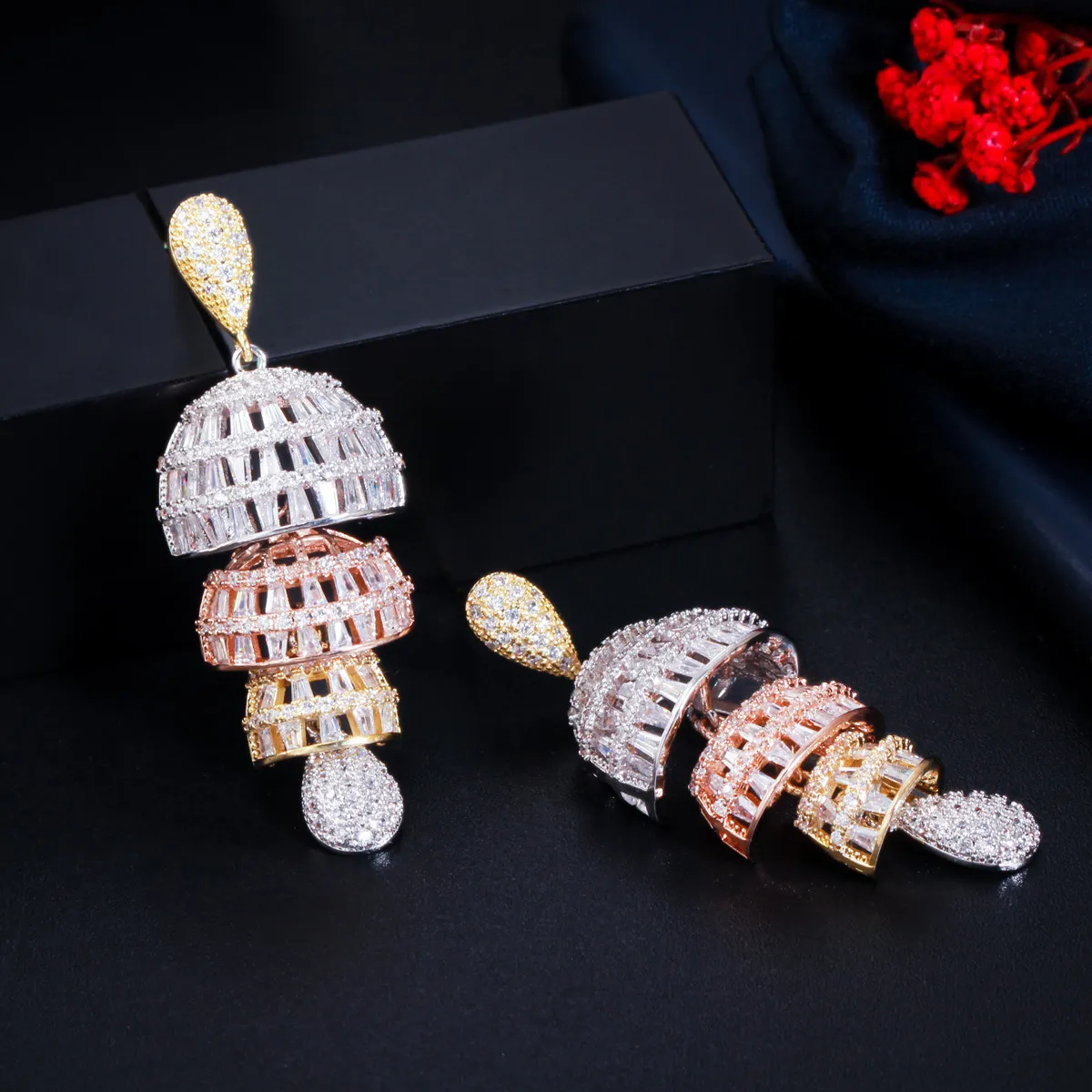 Step into the spotlight with the Ethnic Style Three-Color Electroplated Micro Inlaid Zircon Full Diamond Earrings, a stunning accessory that celebrates the beauty of culture and modern fashion. Perfect for any occasion, these earrings deliver elegance, charm, and versatility. Make them a cherished part of your jewelry collection or gift them to someone special for a touch of timeless brilliance.