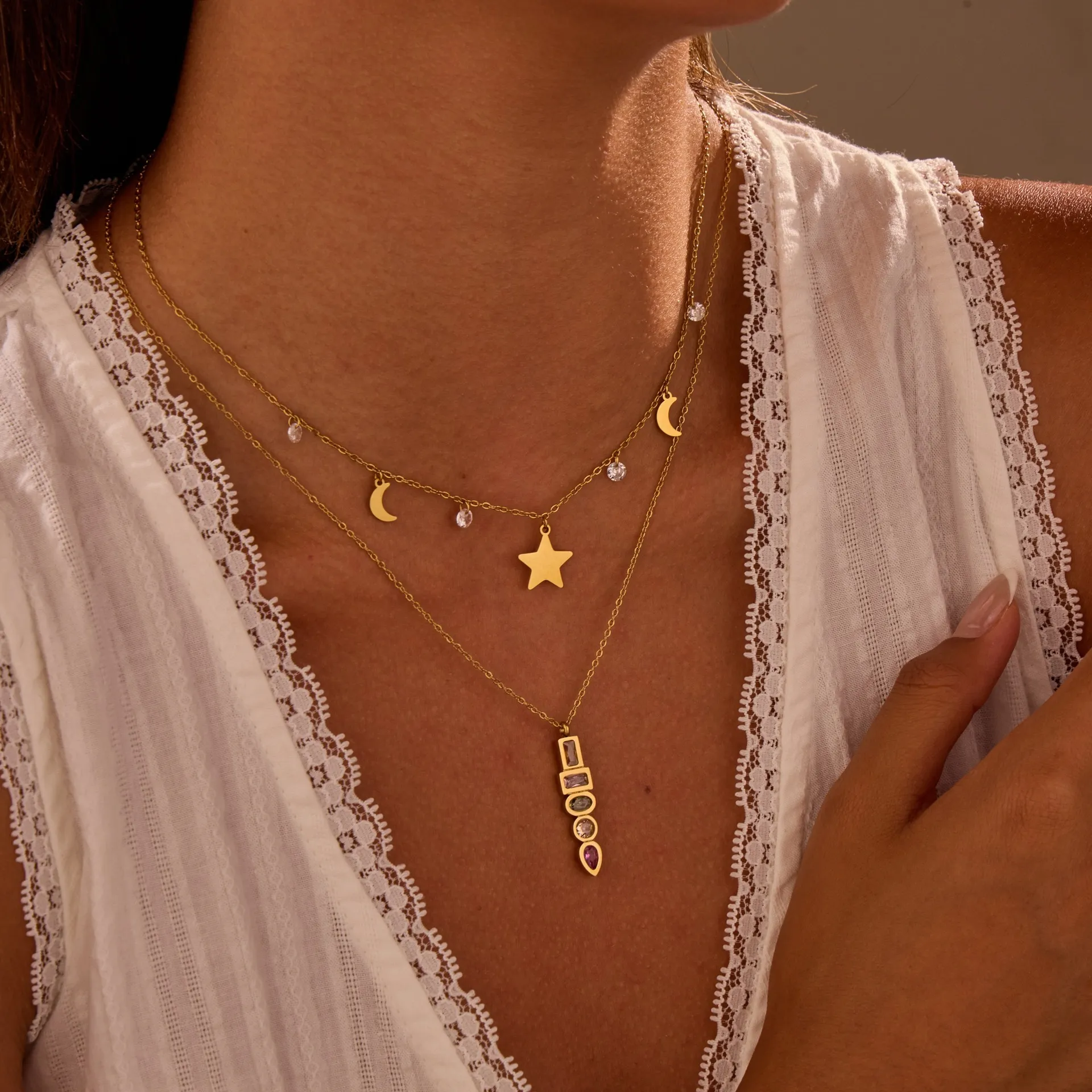 Featuring a star-shaped pendant in multi-colored zircon, this necklace captures light beautifully, creating a sparkling and playful statement piece that’s perfect for any occasion.