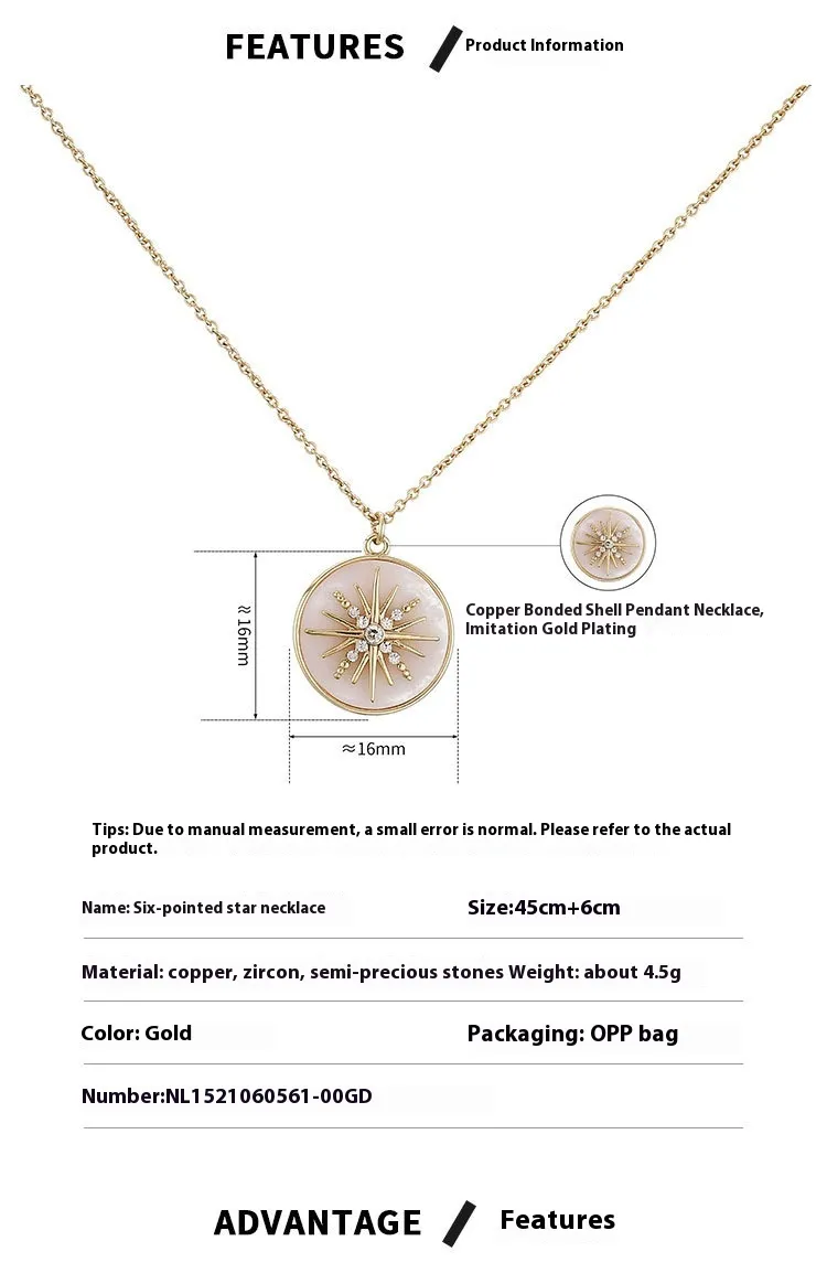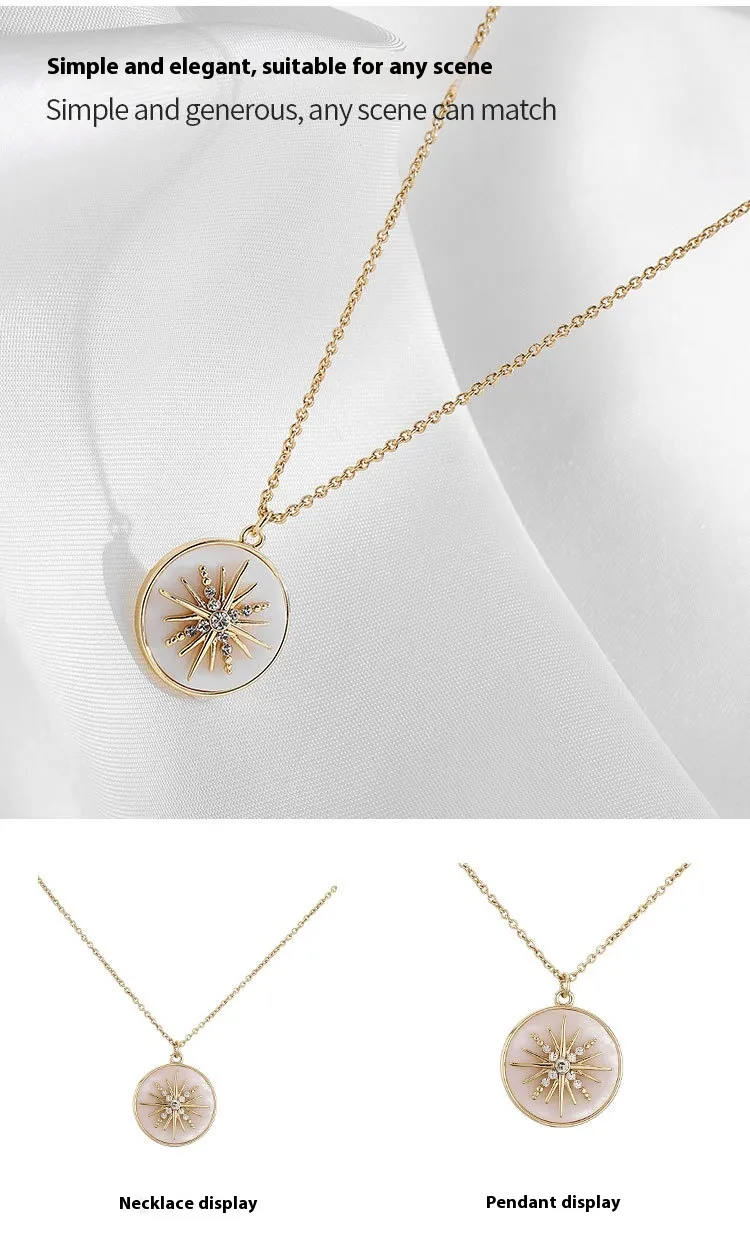 Whether you're celebrating a special occasion or simply adding a touch of elegance to your everyday attire, the European and American Modern White Six-Pointed Star Fritillary Compass Necklace fits seamlessly into any wardrobe. The simple yet striking design means it works just as well for a day at the office as it does for an evening out.