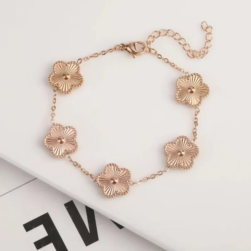 The combination of the clover, plum blossom, and five-leaf flower motifs makes this bracelet not only stylish but meaningful. The clover represents luck and prosperity, the plum blossom symbolizes renewal and beauty, and the five-leaf flower adds an additional layer of symbolism, making it a bracelet full of positive energy.
