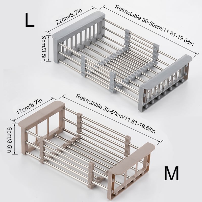 It can be extended from 11.81 inches long to 19.68 inches long. With adjustable bars it adapts to expand for use at the counter, in the sink or on the sink.