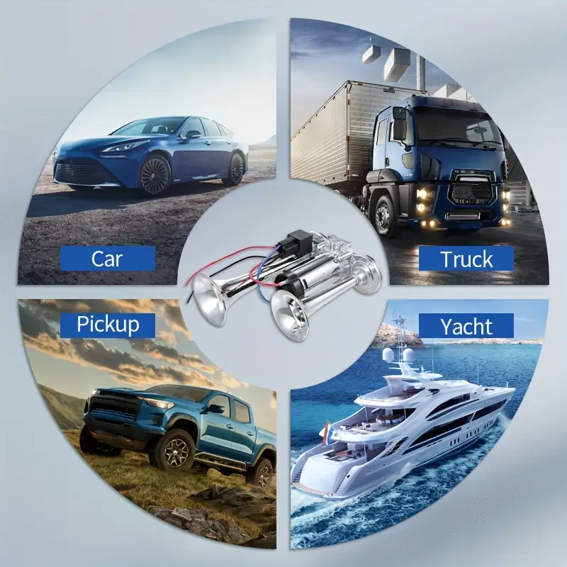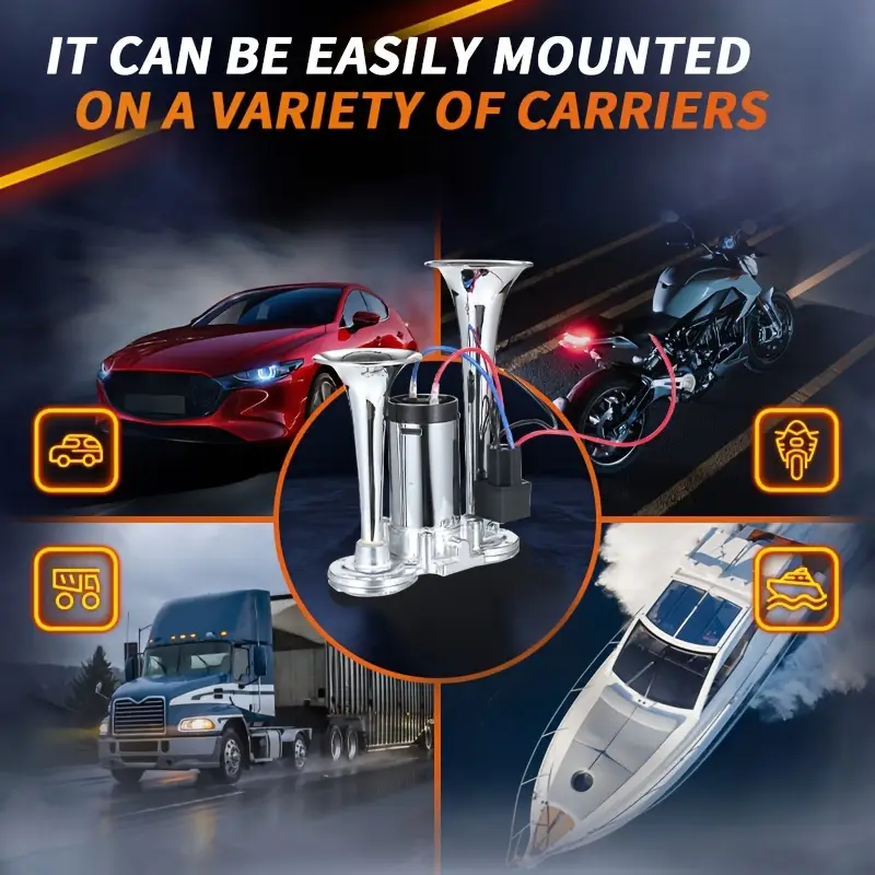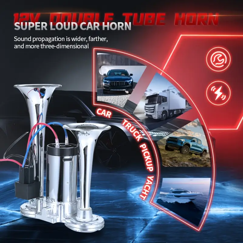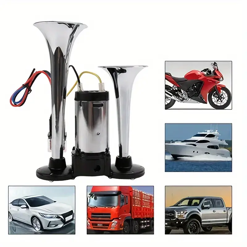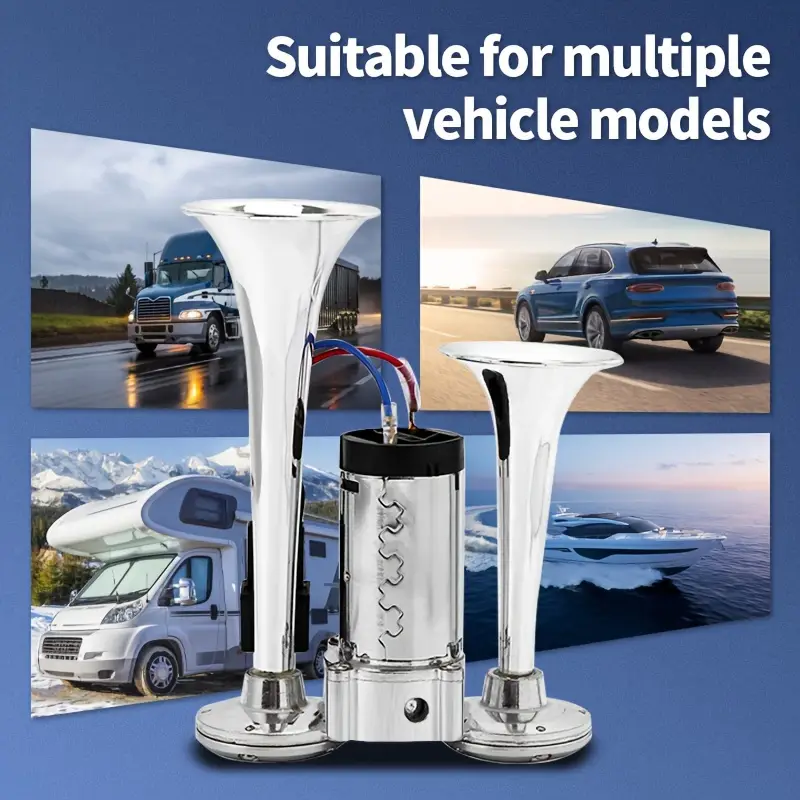 The air horn features a dual horn powered by an air compressor, made from enhanced materials for durability. Product Name: Silver Double Tube Whistle. Material: Metal. Color: Silver. Functionality: 12V. Power Source: Electrical/Hardwired. Application: Designed for 12V vehicles with batteries, including trucks, ships, trains, cars, sedans, trams, and modified vehicles.Enhance the internal parts of the air compressor so that the horn can produce an extremely loud sound. Increase the thickness of the copper wire in the circuit. The transformer has been internally upgraded to better suit 12v vehicles, stabilizing the current and allowing for maximum current release to amplify the sound.Enhance the standard metal at the base of the horn and the exterior of the air compressor by using zinc alloy. This way, the speaker significantly prolongs its lifespan.'%3E%3Crect x='0' y='0' width='1024' height='1024' fill='%2348464c'/%3E%3Cg transform='scale(4.00) translate(0.5 0.5)'%3E%3Cg transform='translate(186.44 217.54) rotate(200.74) scale(24.57 77.04)'%3E%3Cellipse fill='%23adc0ca' fill-opacity='0.50' cx='0' cy='0' rx='1' ry='1'/%3E%3C/g%3E%3Crect fill='%23e3eaef' fill-opacity='0.50' x='21' y='153' width='125' height='20'/%3E%3Cg transform='translate(107.38 49.28) rotate(188.66) scale(109.52 23.02)'%3E%3Cellipse fill='%23000000' fill-opacity='0.50' cx='0' cy='0' rx='1' ry='1'/%3E%3C/g%3E%3Cg transform='translate(118.36 133.50) rotate(346.93) scale(13.87 41.05)'%3E%3Cellipse fill='%23cccbd0' fill-opacity='0.50' cx='0' cy='0' rx='1' ry='1'/%3E%3C/g%3E%3Cg transform='translate(39.48 118.07) rotate(302.57) scale(21.76 77.52)'%3E%3Cellipse fill='%23100000' fill-opacity='0.50' cx='0' cy='0' rx='1' ry='1'/%3E%3C/g%3E%3Cpolygon fill='%23fff6c9' fill-opacity='0.50' points='240.02,178.99,231.95,158.31,183.55,150.76,170.09,169.18'/%3E%3Cg transform='translate(205.50 113.67) rotate(103.64) scale(38.18 62.73)'%3E%3Cellipse fill='%231d100b' fill-opacity='0.50' cx='0' cy='0' rx='1' ry='1'/%3E%3C/g%3E%3Cellipse fill='%23000000' fill-opacity='0.50' cx='144' cy='185' rx='38' ry='20'/%3E%3Cellipse fill='%23aab4bf' fill-opacity='0.50' cx='229' cy='16' rx='220' ry='6'/%3E%3Cellipse fill='%238192ab' fill-opacity='0.50' cx='44' cy='255' rx='113' ry='20'/%3E%3C/g%3E%3C/g%3E%3C/svg%3E)