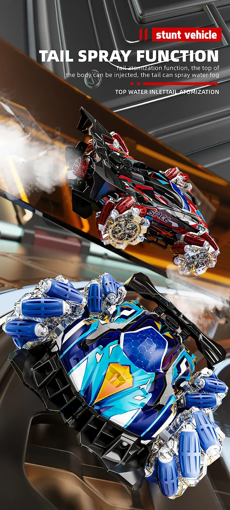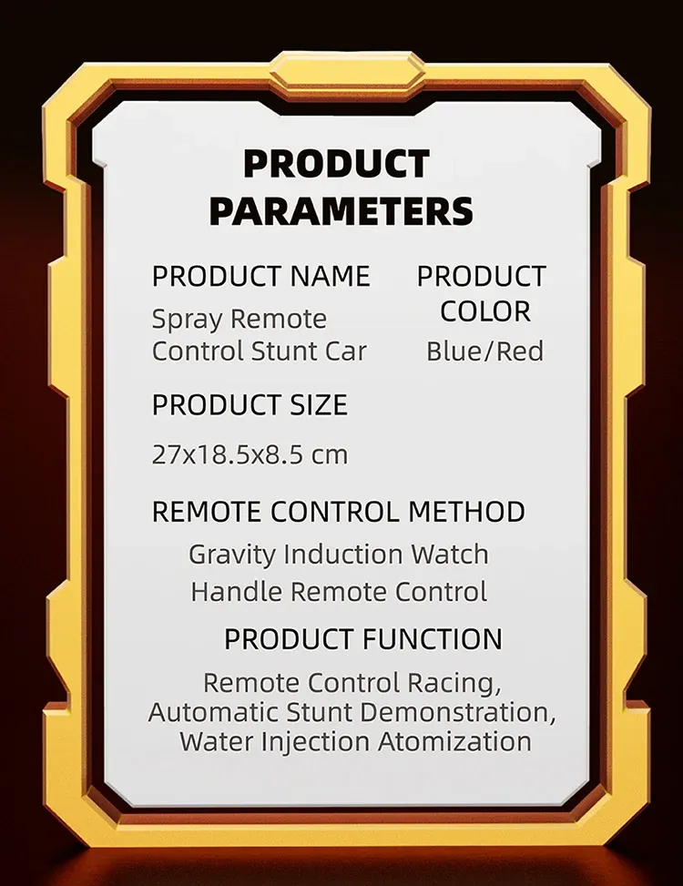 The 4WD capability and flexible suspension system provide excellent stability, allowing the car to easily conquer uneven surfaces, sand, grass, or gravel. This RC car performs flips, drifts, and 360-degree spins with ease, thanks to its advanced gesture control system. Simply move your hand to guide the car or use the remote control for precision driving. The car's simulated spray feature adds an extra thrill, releasing mist as it races, mimicking the exhaust of a real F1 car.