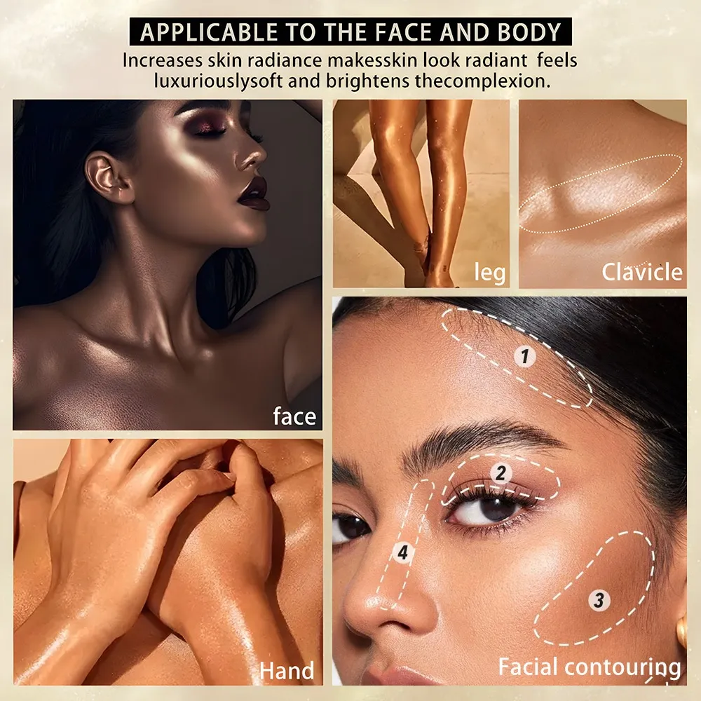 From face to body, this product adapts beautifully. Use it to highlight cheekbones, collarbones, shoulders, or shins for a sun-kissed glow. Its silky texture glides on evenly, offering a streak-free finish every time.