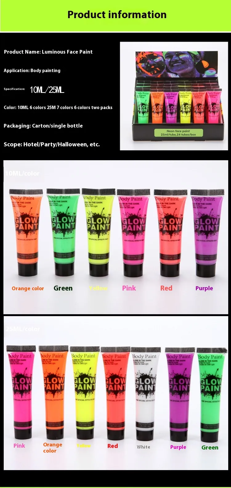 in various colors and formulas, including water-based, cream, and gel types. It is commonly used for parties, festivals, Halloween, theater