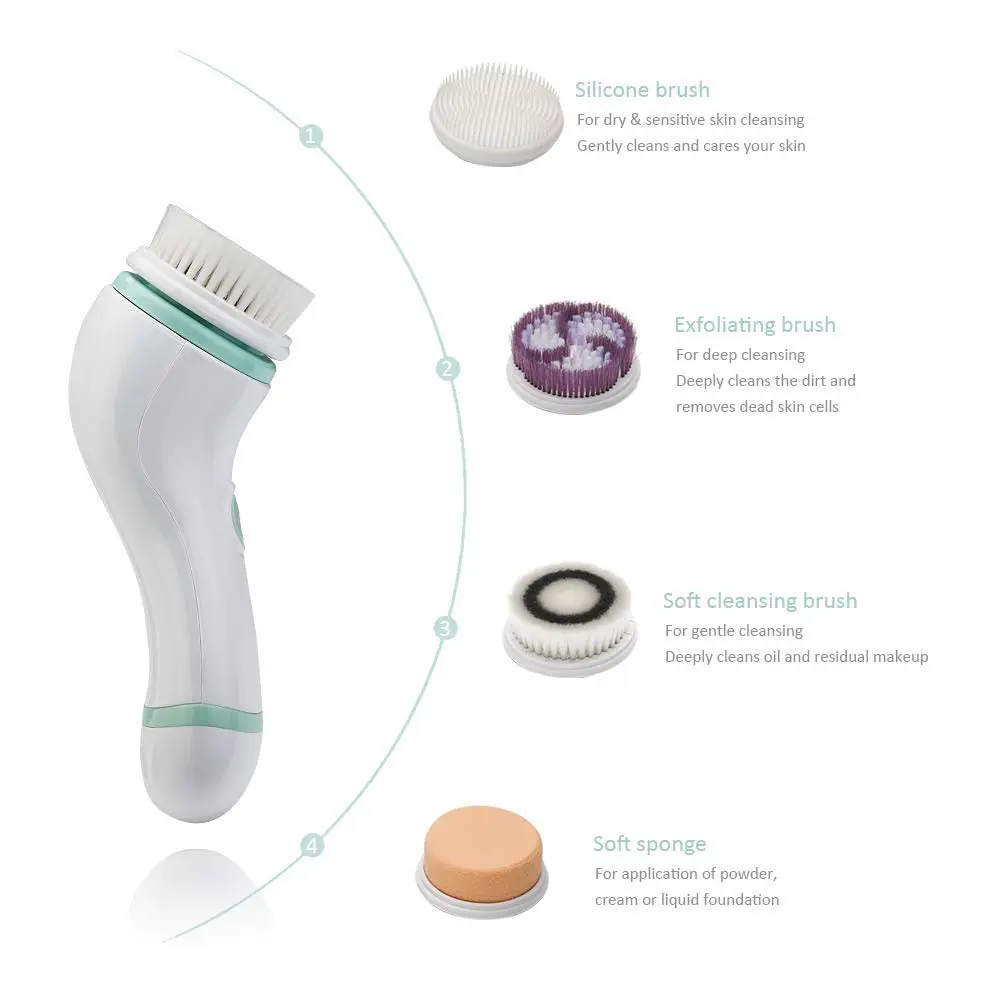The full cleaning system 4 includes an exfoliating brush, a soft brush, a soft sponge and a silicon brush in the 1-4 brush head.Suitable for all types of skin and all your facial cleansing needs
