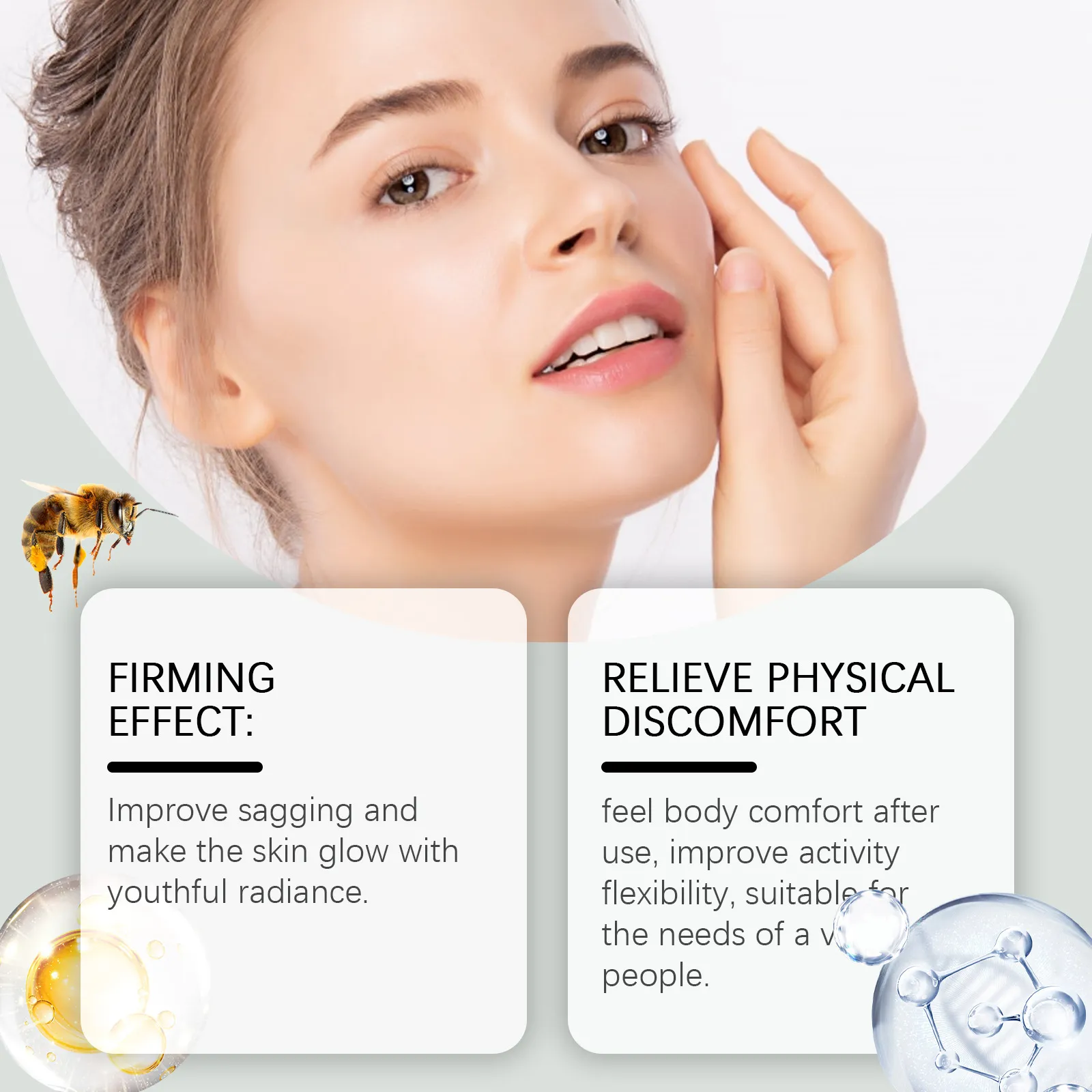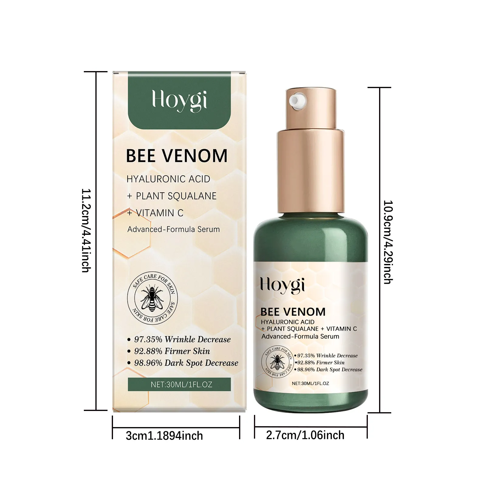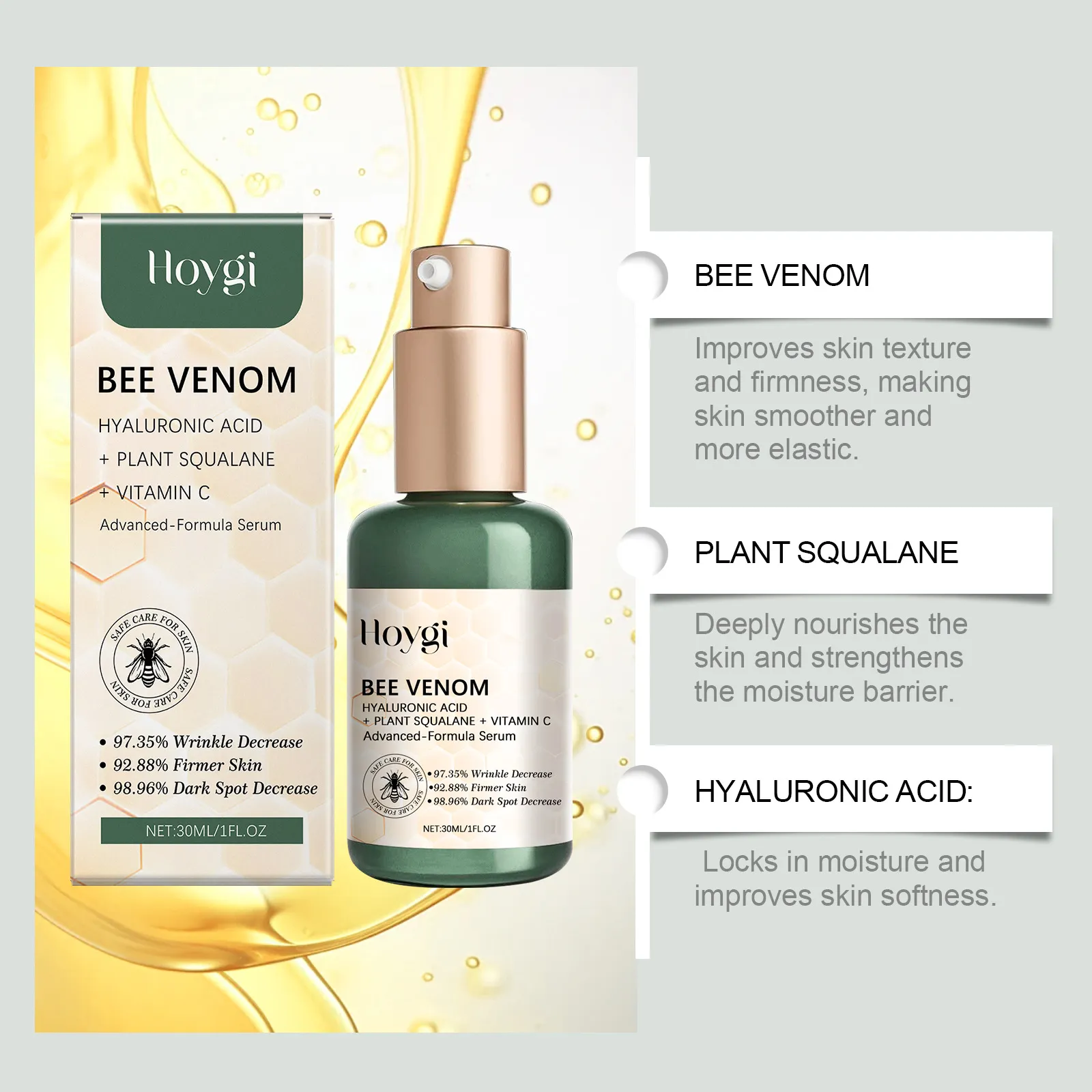 Ingredients: Water, glycerol, Hydroxyethyl Cellulose, bee venom, squalane, hyaluronic acid, vitamin C (ascorbic acid)