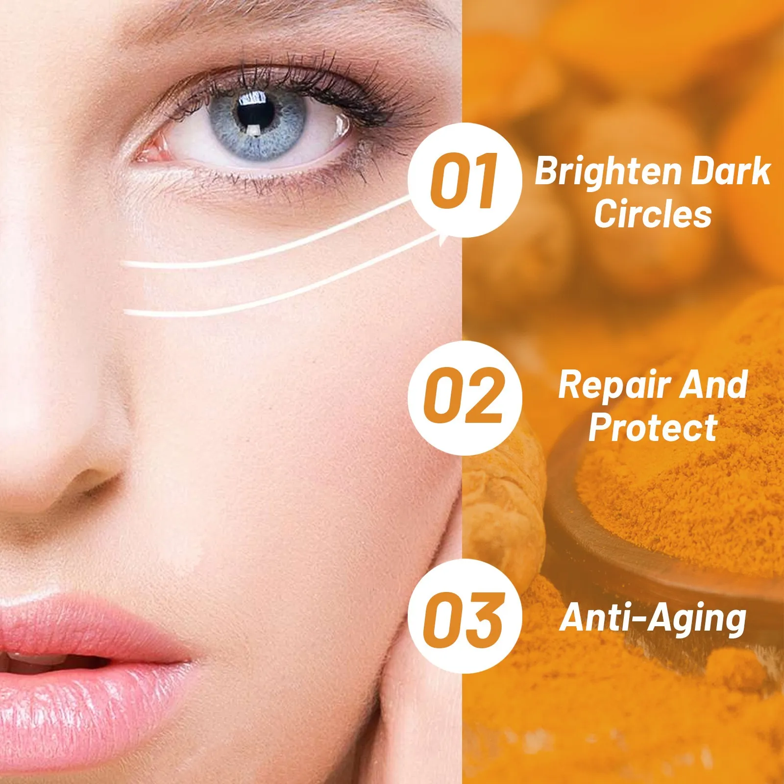 The combination of anti-inflammatory turmeric, hydrating hyaluronic acid, and protective antioxidants provides a 360° approach to eye care — targeting darkness, puffiness, wrinkles, and dehydration simultaneously.