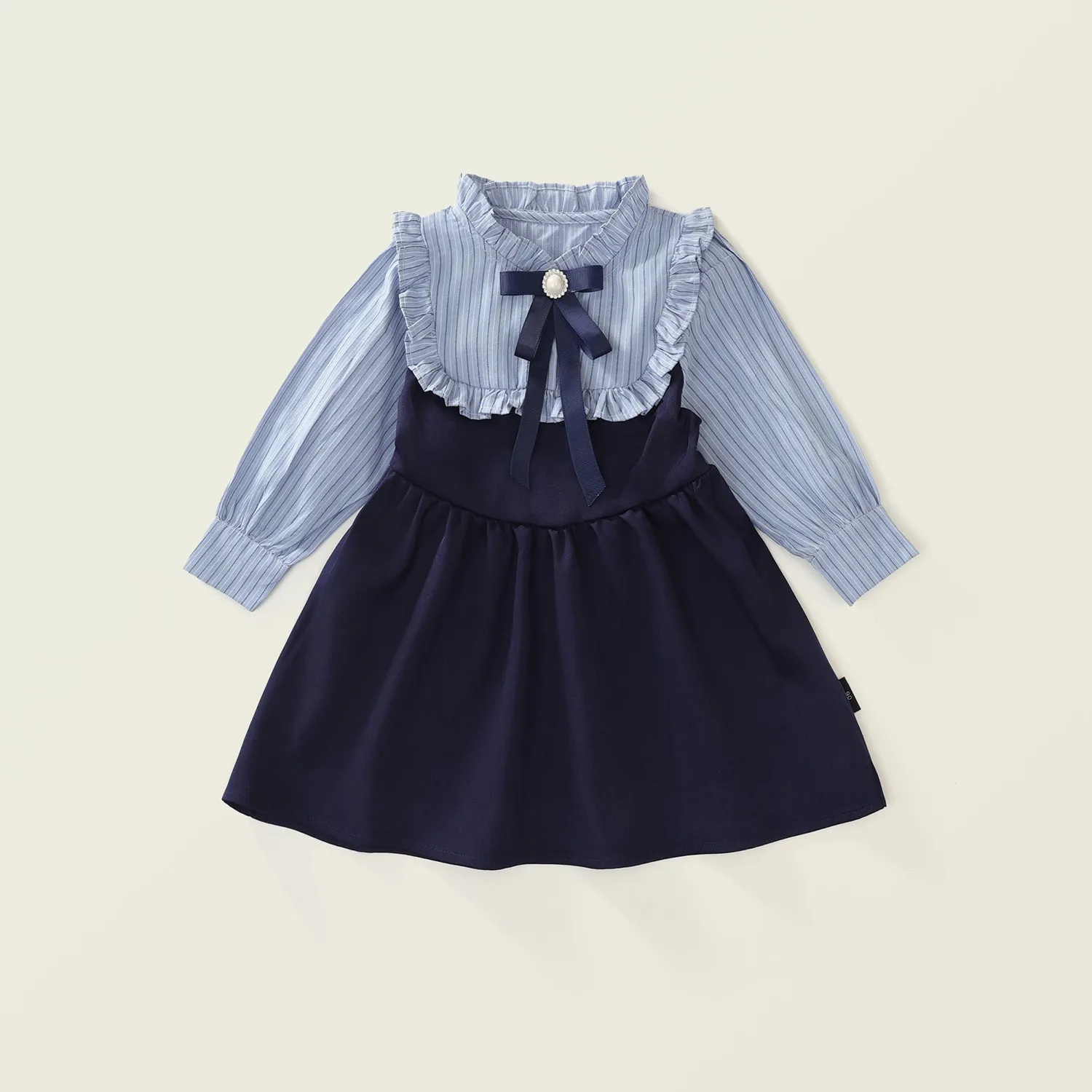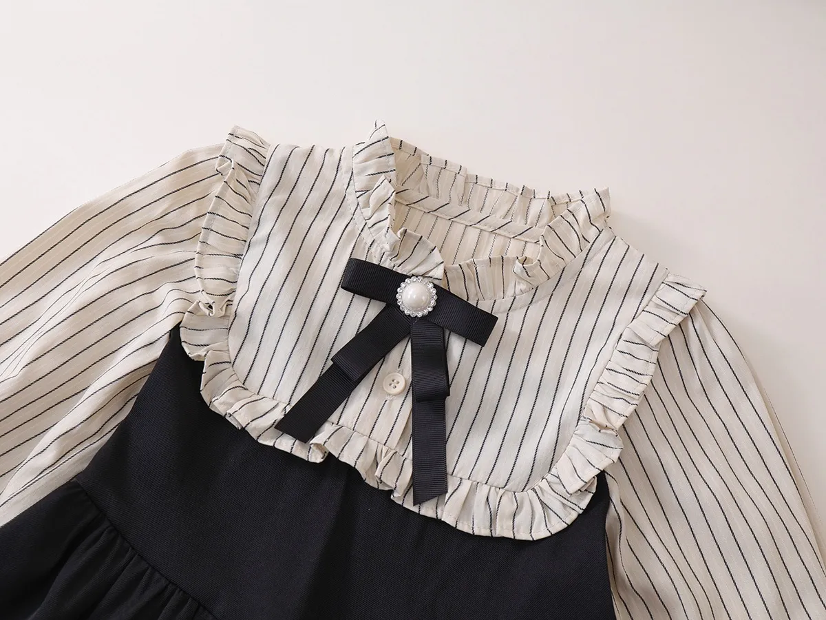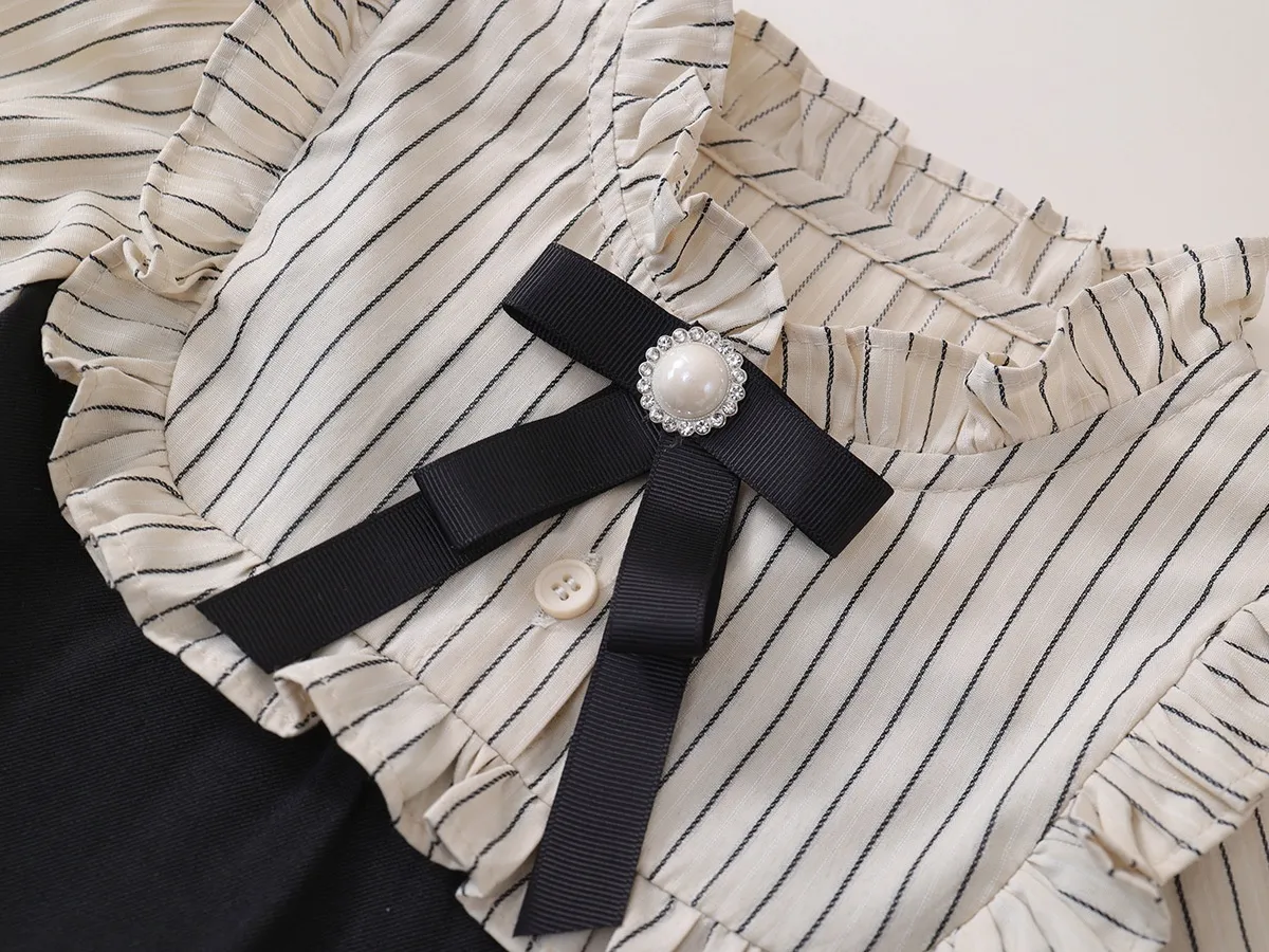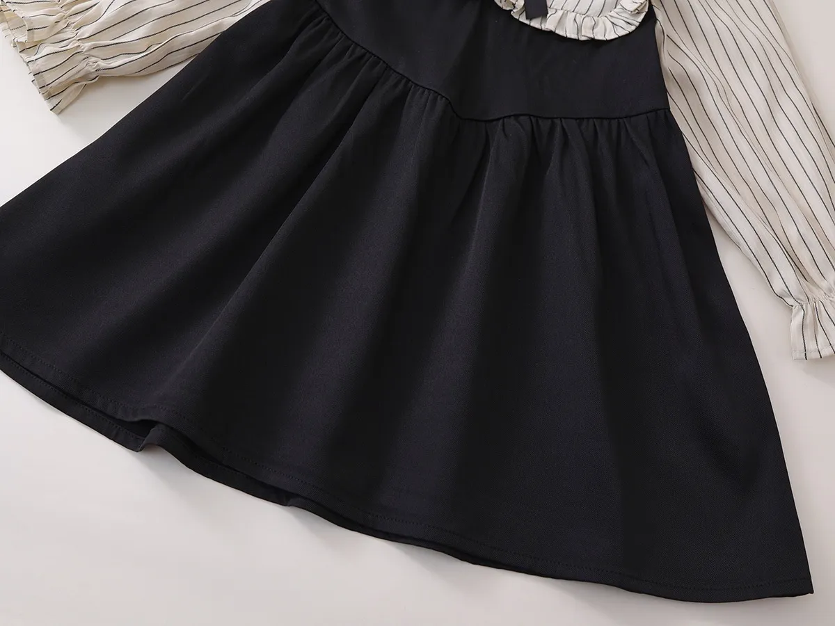 The Fake Two-piece Korean Striped Contrast Color Long Sleeve Skirt features a clever two-piece illusion, combining a long sleeve top with a skirt that looks like a matching set. This style eliminates the need to coordinate separate pieces, making it a go-to outfit for busy mornings when your child wants to look stylish without spending time putting together an outfit.