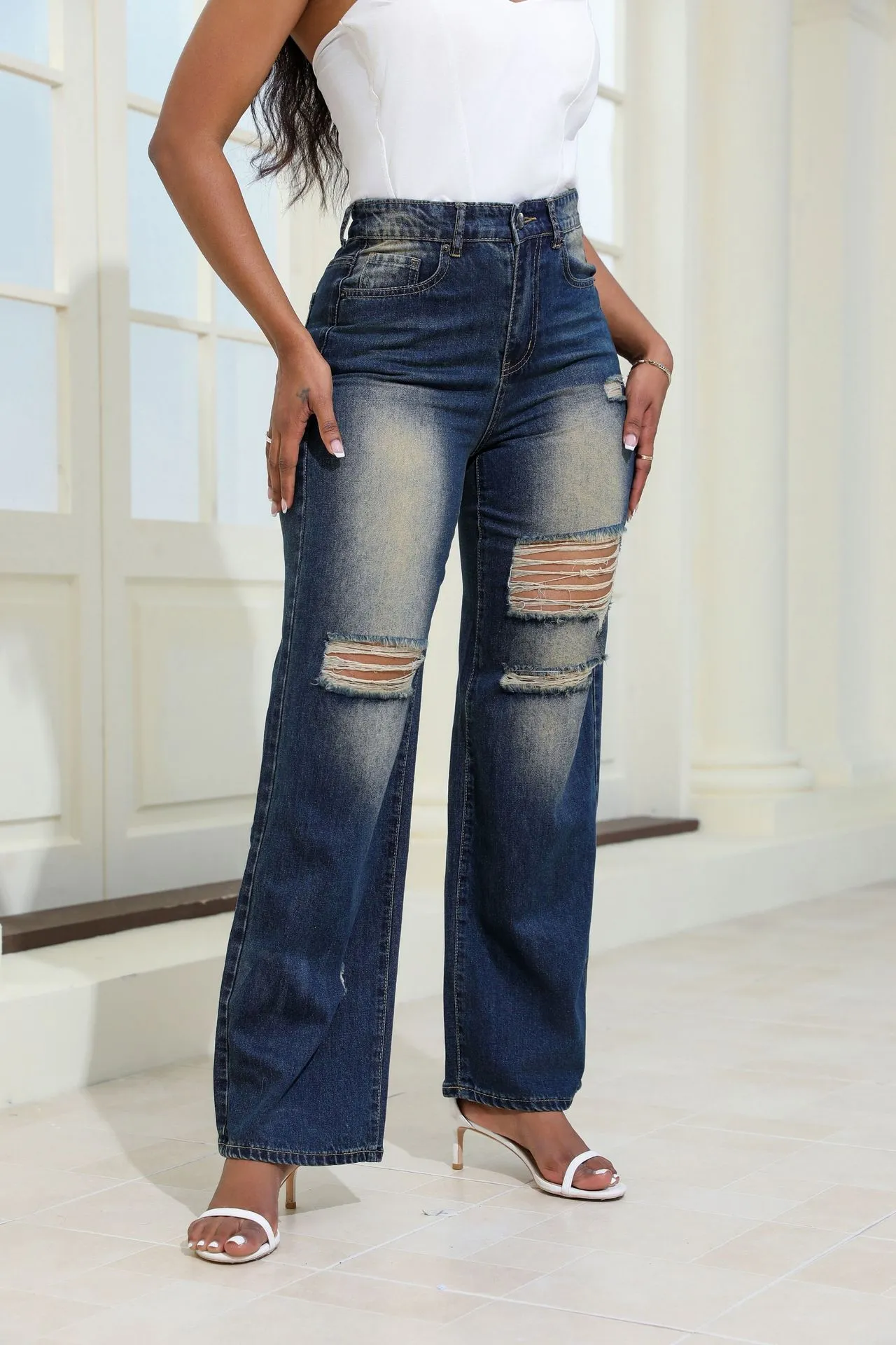 These straight wide-leg ripped jeans are easy to style with everything from sneakers to heels, making them a versatile wardrobe essential. Whether you’re going for a casual streetwear look or dressing them up for a night out, these jeans offer endless styling possibilities. Their relaxed fit through the leg ensures maximum comfort while maintaining a chic, polished appearance.