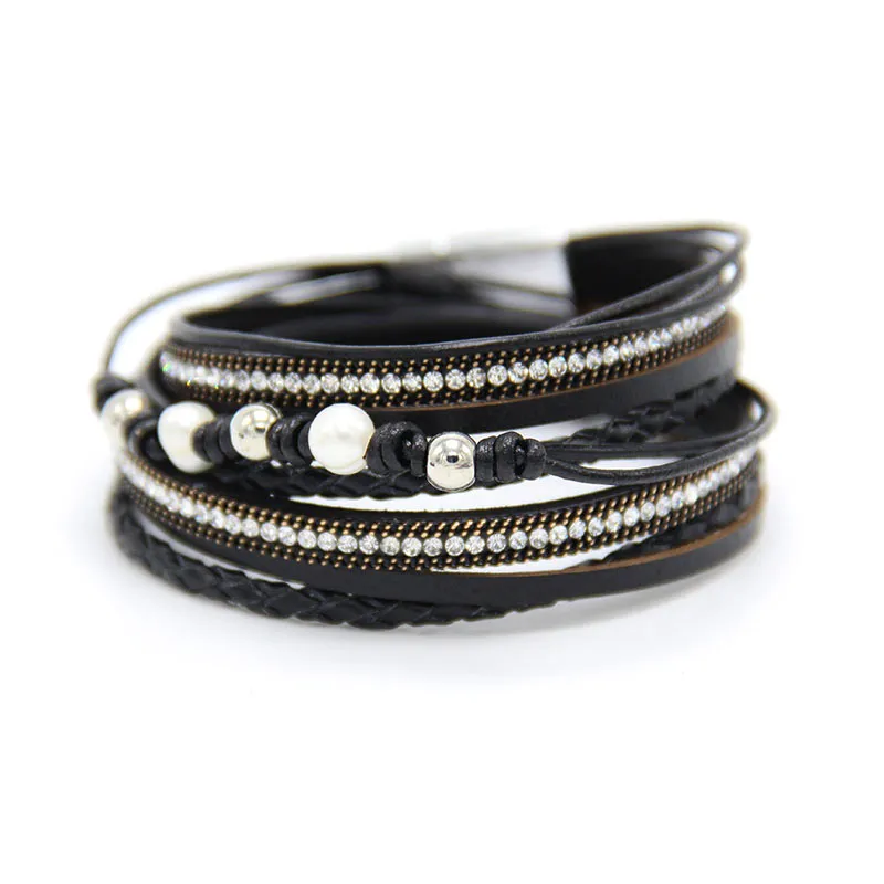 Fashion Magnetic Snap Cowhide Woven Pearl Bracelet