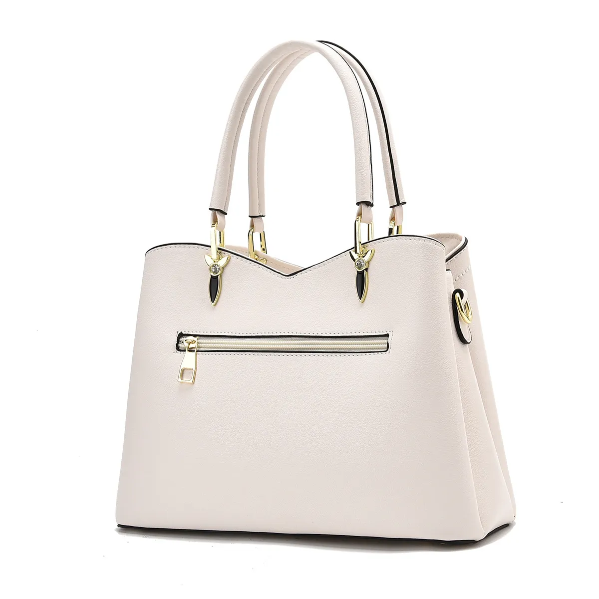 This bag features elegant hardware, including gold-toned or silver-toned accents for a touch of class. The attention to detail is evident in the smooth zippers and refined clasps, which add an extra layer of sophistication. The clean lines and polished finish contribute to the overall elegant aesthetic.