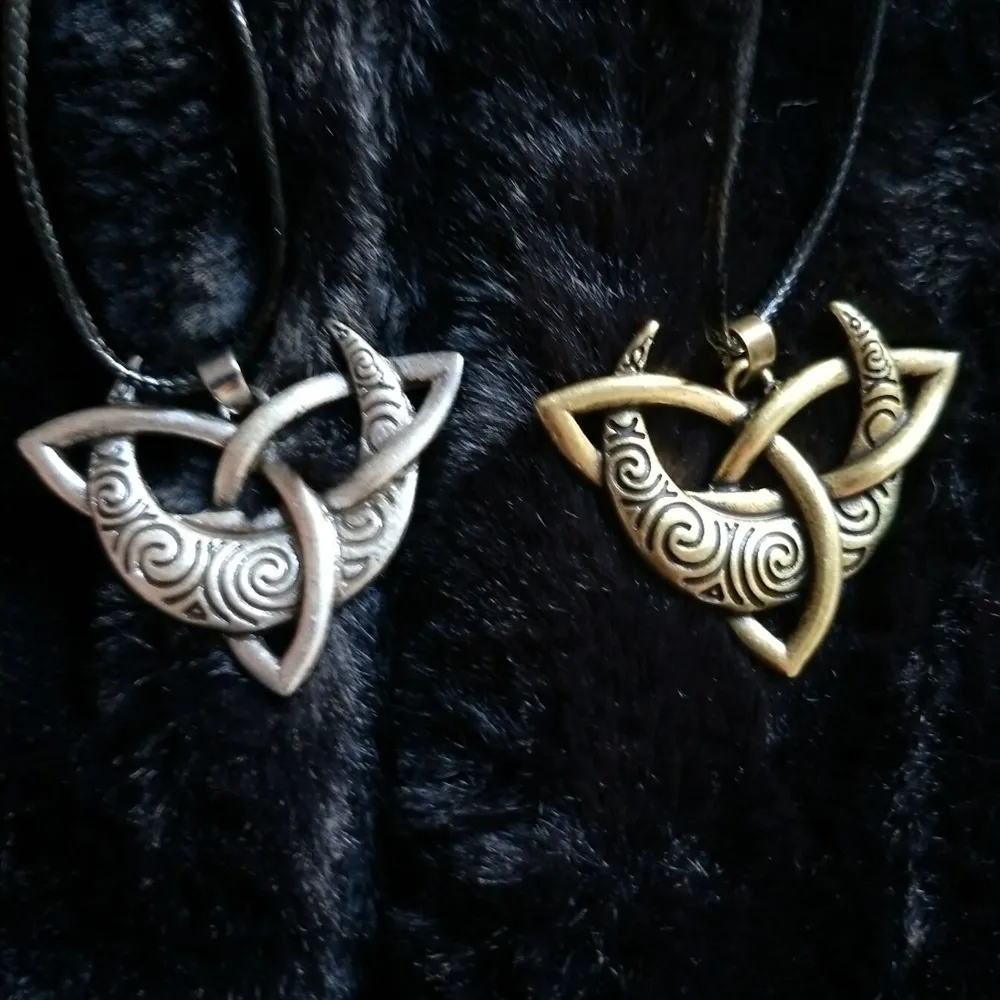 celestial and spiritual symbolism with modern elegance. The moon pendant and trinity design offer a