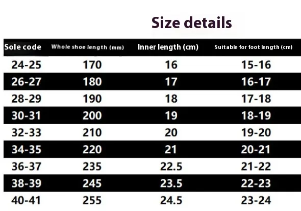Size: 26-27 [suitable for foot length 16-17cm],28-29 [suitable for foot length 17-18cm],30-31 [suitable for foot length 18-19cm],32-33