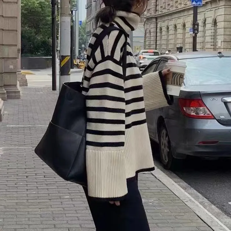 Fashion Striped Turtleneck Sweater Casual Loose Slit Design Sweater Winter Tops Womens Clothing