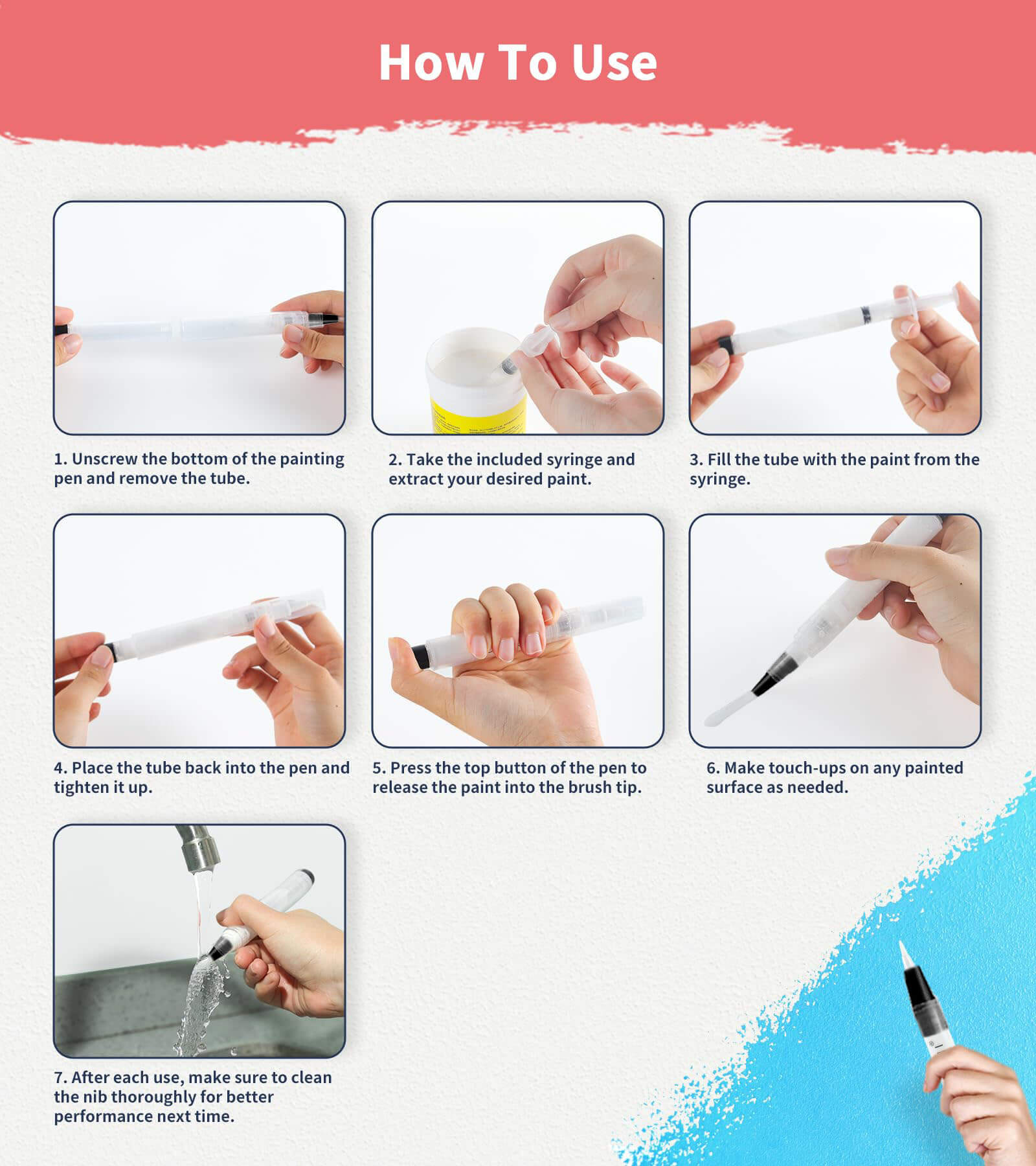 - ã€MULTIFUNCTIONAL PAINT REPAIRER】- Our tip of touch up paint pen is a soft brush, perfect for helping you quickly repair scuffs and scratches, chips, or nail holes on walls, trim, ceiling, and doors. Compared with ordinary paint brushes or paint rollers, it is more convenient to use in narrow spaces, without worrying about paint splatters or drips.