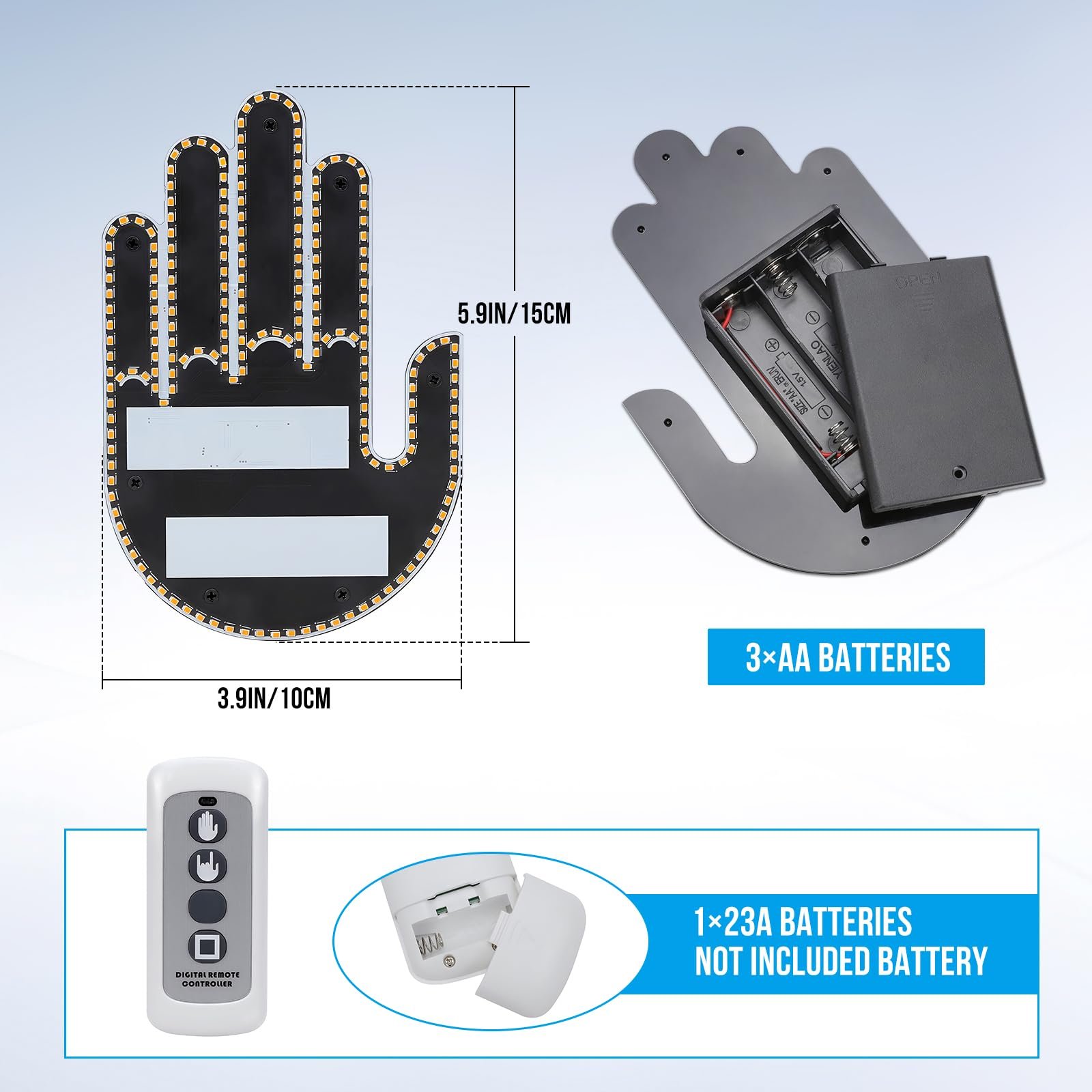 Reliable Construction: Made with a premium plastic lampshade and PVC housing, this led car sign light is built to last. It offers quick heat dissipation and low power consumption, making your drives more enjoyable and safe. The Gesture Finger Light runs on 3 AA batteries.