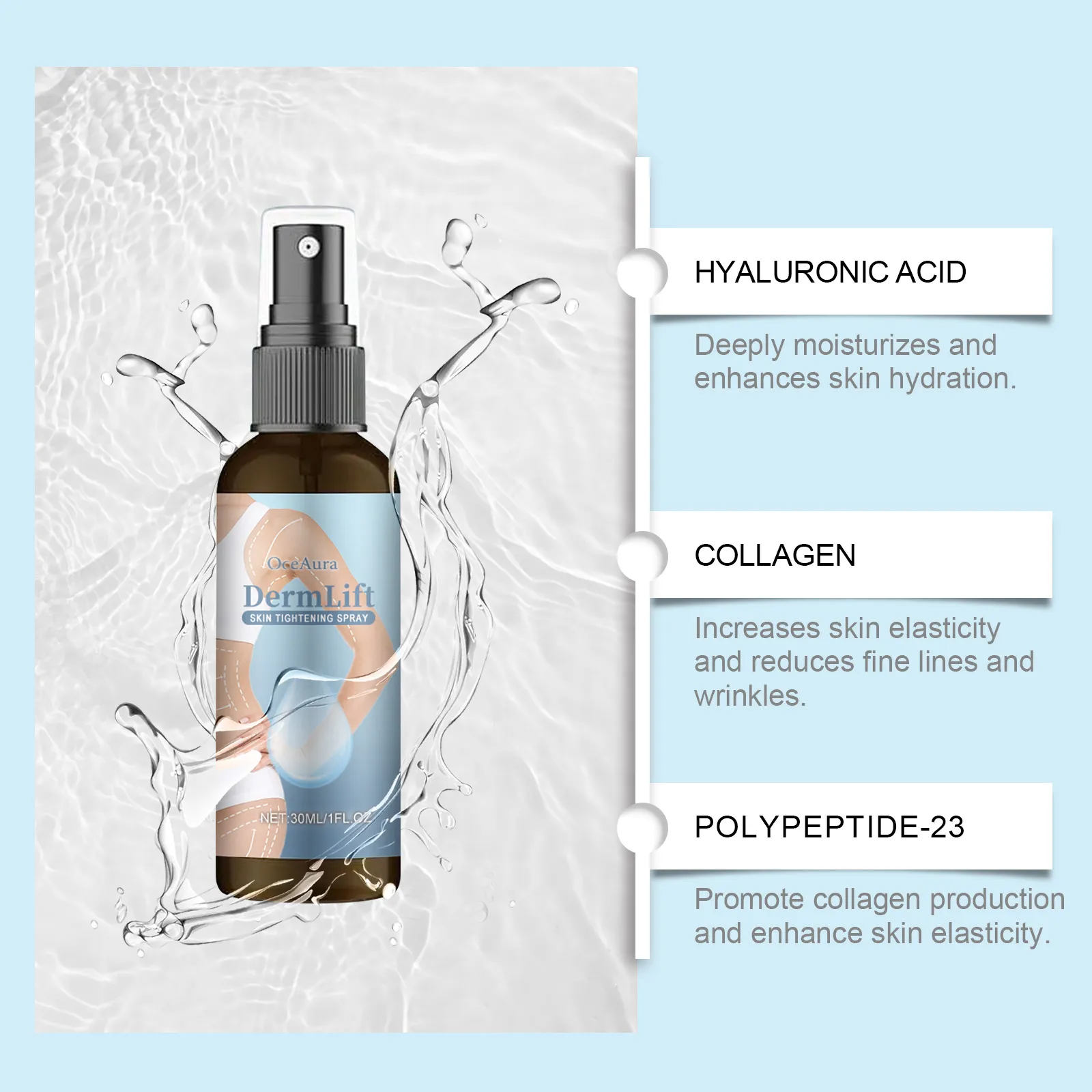 Product ingredients: water, hyaluronic acid, collagen, polypeptide-23, glycerol