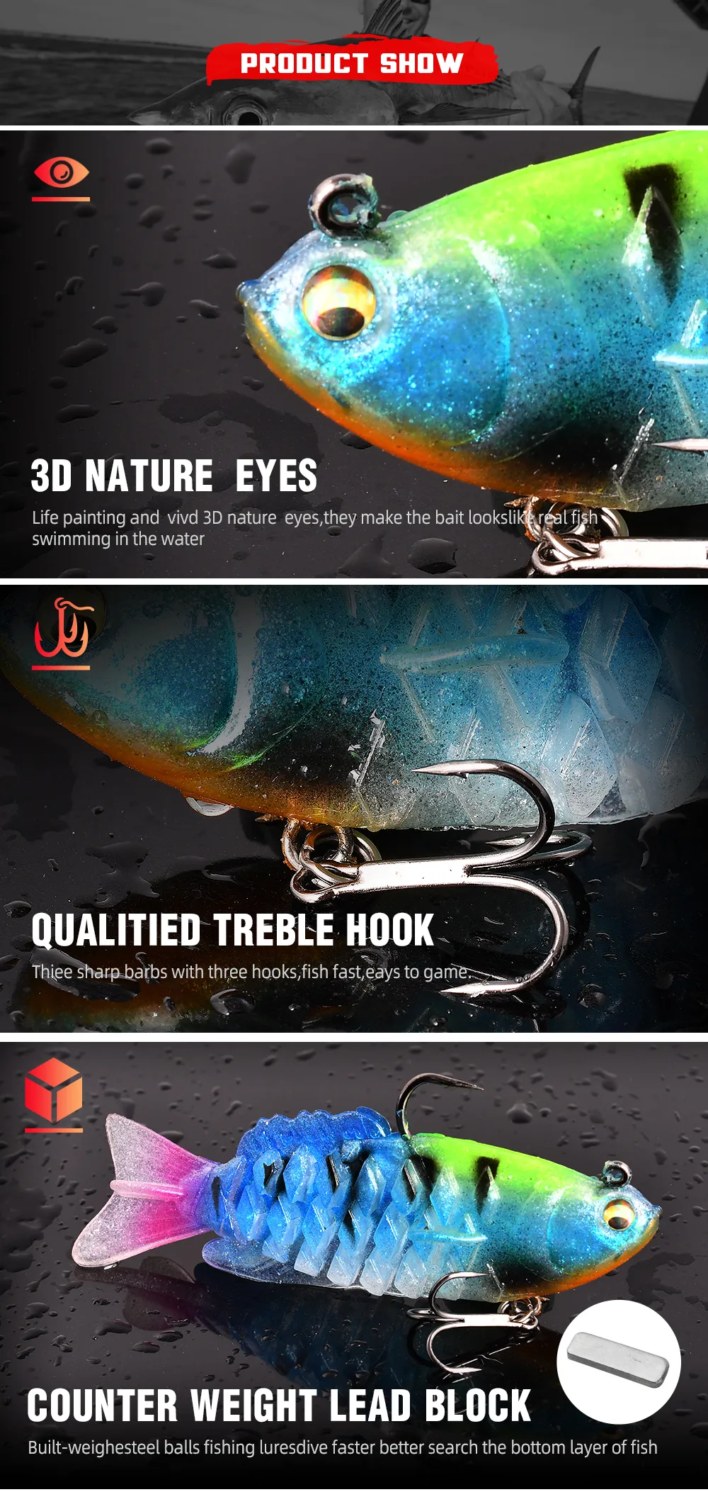 2.The RHOMBIC design makes the fish body better swimming posture underwater, and the RHOMBIC design of tensile resistance and biting