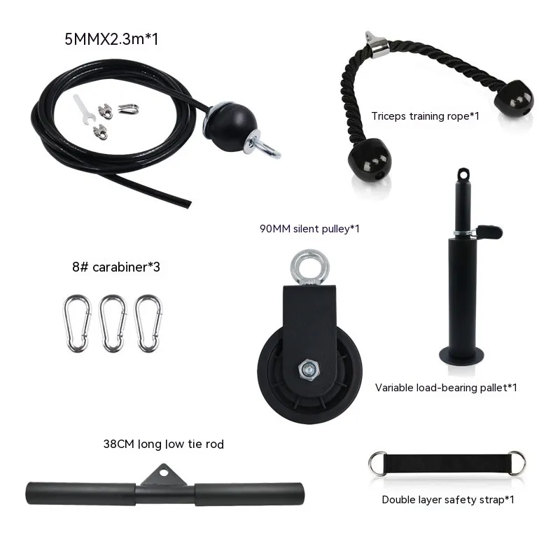Triceps training rope * 1 Variable load tray * 1 Double layer safety strap * 1 38CM long low pull rod * 1 90MM silent pulley * 1 8 #
