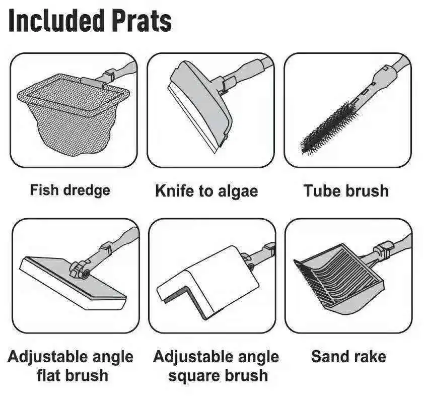 Versatile Cleaning Attachments: Brushes designed for different tasks, including algae scraping, glass cleaning, substrate