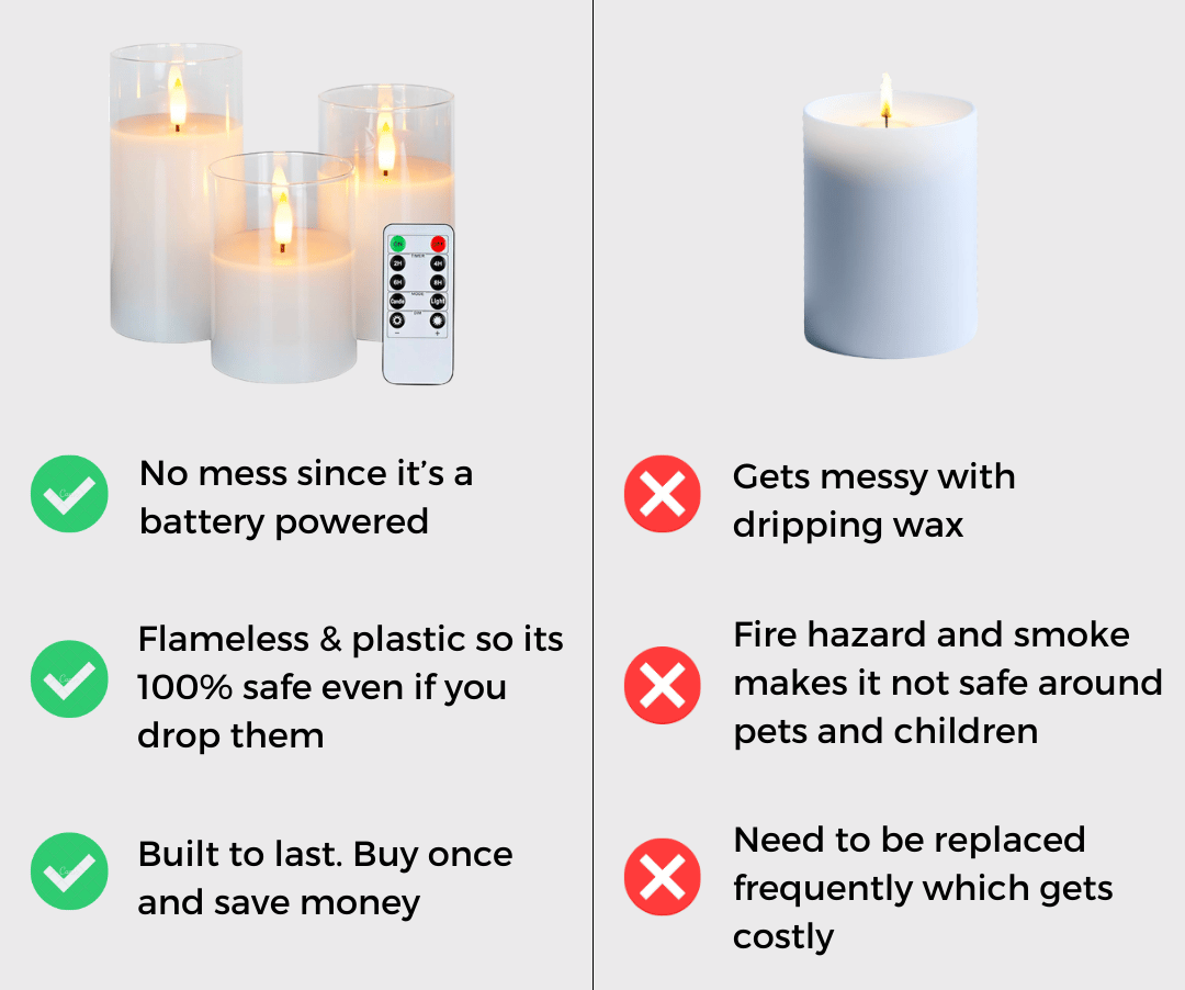 Say goodbye to dripping wax, smoke, and the constant need for replacements.Flameless Candles are powered by long-lasting batteries,