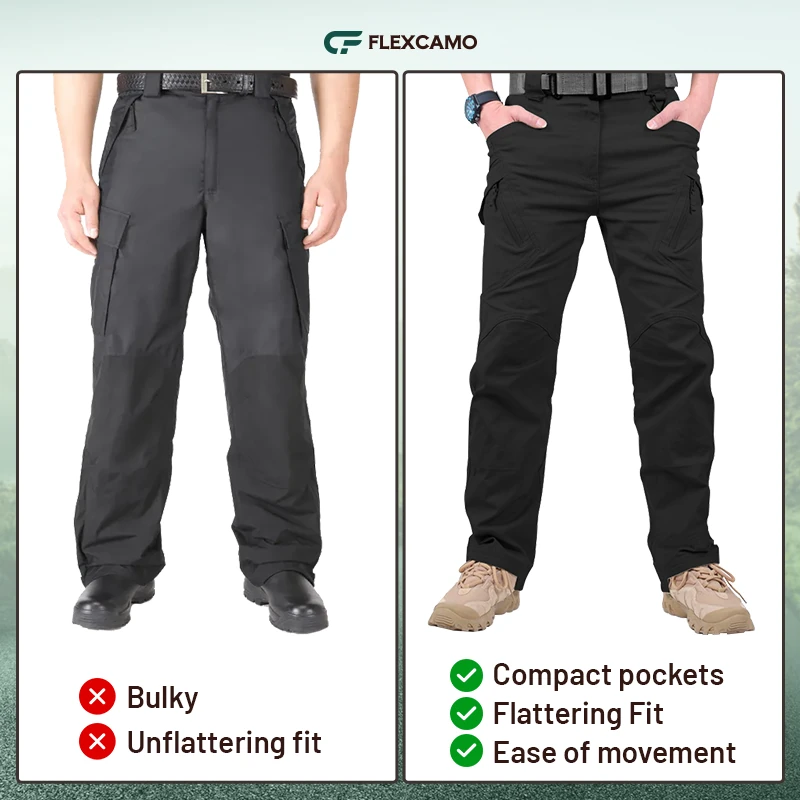 Unlike traditional tactical pants that feel rigid, FlexCamo is designed for freedom of movement. The flexible waistband and ergonomic knee design allow you to bend, crouch, and climb without restriction.