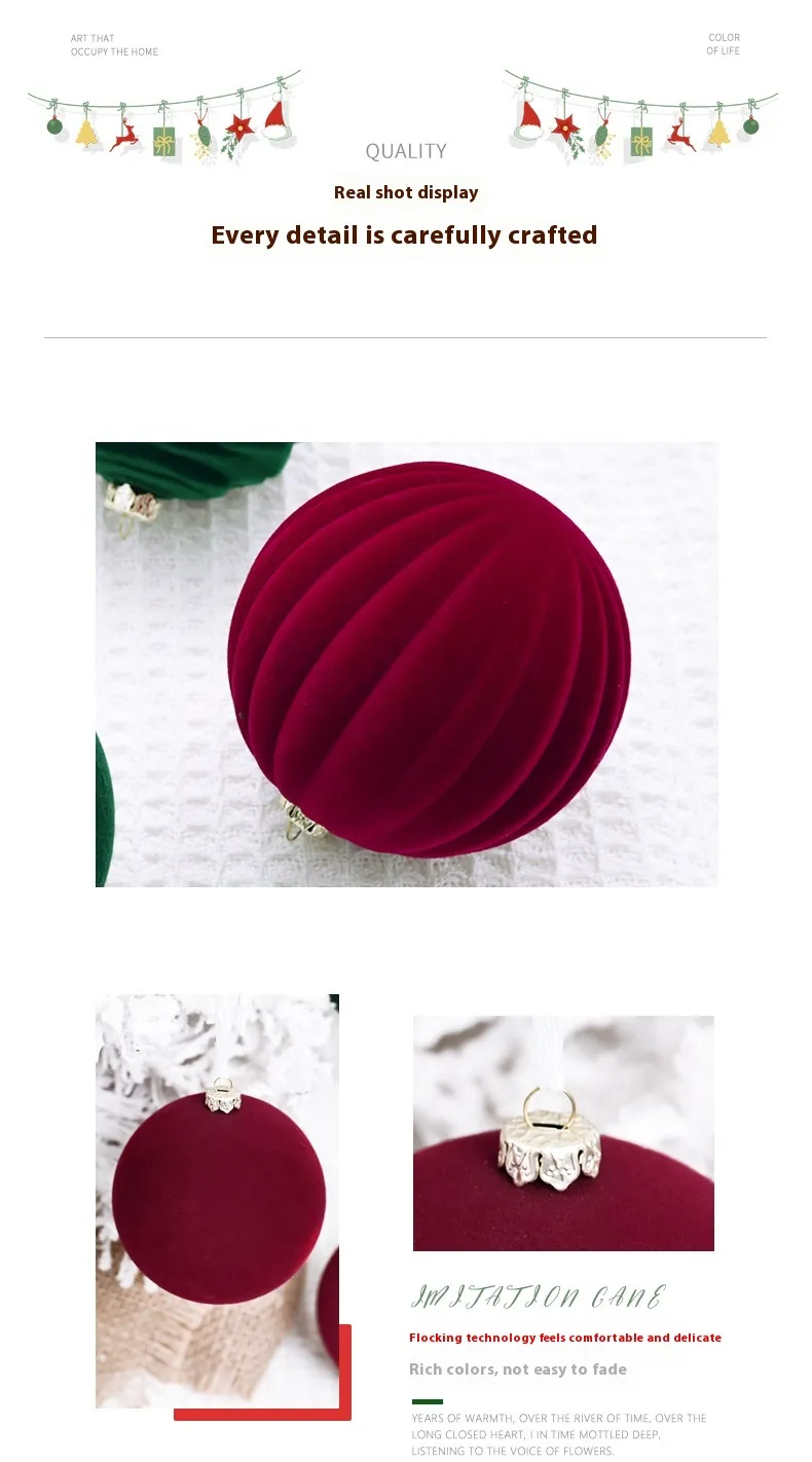 Transform your holiday tree into a magical winter wonderland with these Flocking Christmas Ball Tree Pendants. Their soft, textured finish and deep colors create a cozy, festive atmosphere in your home. Perfect for adding a touch of elegance and charm to your Christmas decorations, these ornaments will be a beloved addition to your tree for years to come