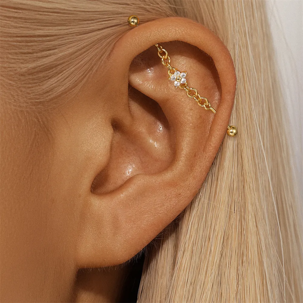An industrial piercing involves two holes pierced in the upper ear, connected by a single piece of jewelry, often a barbell. A flower industrial piercing features a decorative flower design, either at one or both ends of the barbell, making it a more intricate and eye-catching choice. This piercing is popular for its bold and fashionable look, combining the edginess of an industrial piercing with the delicate appeal of floral designs.